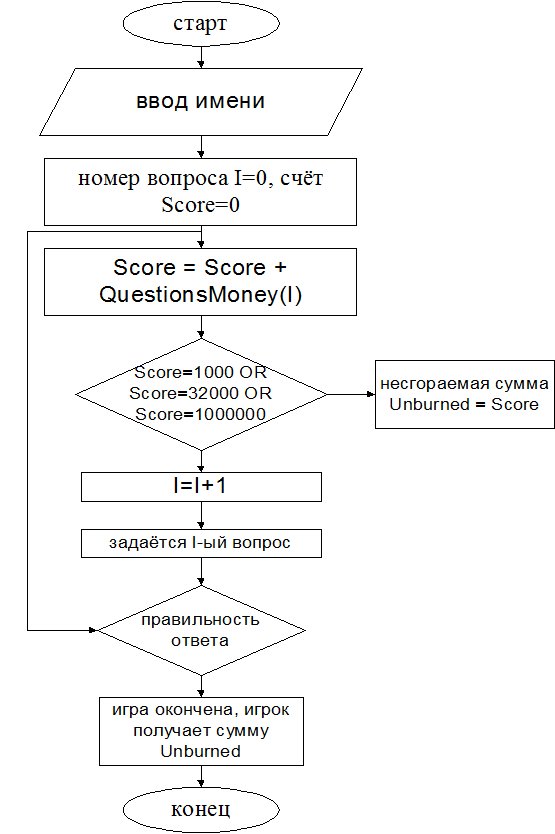 Кафедра системного анализа и управления Курсовая работа ../../../../../HTML/Учёба/История/EXPRESSIONIZM.files/munch.scream.jpg По технологии программирования «Игра ‘Кто хочет стать миллионером?’» Дубна, 2003 Оглавление 1. Введение 2. Постановка задачи 5. Блок-схема основной программы9 6. Блок-схема дополнительной процедуры7 7. Листинг программы 8. Вывод 9. Список литературы 1. ВведениеСегодня на нашем телевидении всегда можно увидеть множество развлекательных программ. К примеру, “Слабое звено”, “Поле чудес”. Все мы видели их и знаем, что они из себя представляют. Из всего этого множества я выбрал “Кто хочет стать миллионером?” в качестве предмета для написания курсовой работы. В телевизионном варианте выиграть миллион удавалось всего лишь нескольким людям. В её электронном аналоге сделать это не составить такого большого труда, но зато и игра идёт не на настоящие деньги. В любом случае, вы сможете отдохнуть, играя. Разработать игру-аналог известной телевизионной передачи “Кто хочет стать миллионером?” с использованием программной среды VisualBasic и средств объектно-ориентированного программирования. 3.Теоретическая частьПри написании программы я пользовался такими элементами, как Form, TextBox, CommandButton, Line, ListBox, Label, Image. Объект Form при организации проекта форма даётся по умолчанию. Её нет на стандартной панели управления. Однако форма также является объектом, у неё имеется свой набор свойств и событий. На панели управления имеется пиктограмма AddForm, добавляющая в проект ещё одну форму, а не создавая новый. Для объекта CommandButton о сновное событие, связанное с ним, это Click(). После щелчка определённые действия, связанные с данной кнопкой, будут совершенны немедленно. С кнопками связаны не только события, но и свойства. В данной программе мы использовали свойство Enabled – делающее кнопку либо активной, либо неактивной. Данное свойство может принимать два значения – True или False. Также имеются свойства, отвечающие за положение кнопки на экране – свойства Top, расстояние между верхней стороной объекта и верхней границей контейнера, его содержащего, и Left, расстояние между левой стороной объекта левой границей контейнера, его содержащего. Объект TextBox служит для вывода, ввода и редактирования текста. Для этого поля можно задавать различные шрифты, размеры букв, цвета, ограничивать количество вводимых букв. По умолчанию это поле содержит одну строку текста, однако этот режим можно изменить на многострочный. Также элемент обладает свойствами Top, Left, описанными выше для элемента CommandButton; свойством ForeColor, отвечающим за цвет вводимых букв. Объект Line использовался в моей программе для различных оформительских целей. Обладает свойствами BorderColor – цвет данной линии, BorderStyle – внешний вид линии, BorderWidth – толщина линии, Visible – видимость объекта на форме. Объект ListBox позволяет пользователю выбирать из списка одно или несколько значений. В любой момент в список можно добавить новые значения или удалить существующие. Если список не сможет отобразиться в заданном размере объекта целиком, то в поле списка автоматически добавляется полоса прокрутки. Объект Image предназначен для отображения рисунков. В него можно поместить растровый рисунок в формате bmp, wmf, ico, gif. Можно выбрать режим отображения: или размеры рисунка изменятся до размеров заданного элемента Image, или элемент Image изменится до размеро