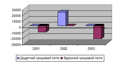 Рис. 3.4 Аналіз грошових потоків ВАТ “ЗСПЗ” по фінансовій діяльності Проаналізувавши рух коштів по операційній, інвестиційній і фінансовій діяльностях, можна сформулювати такий висновок: сукупний грошовий потік у 2001 році є додатним унаслідок переваги сукупного від’ємного потоку коштів по основній та інвестиційній діяльності і високого значення сукупного додатного грошового потоку по фінансовій діяльності, що перевищує від’ємний потік на 897 тис. грн. У 2002 році сукупний грошовий потік також має додатне значення – 4534 тис. грн, однак у цьому випадку ця цифра отримана в результаті різниці сум сукупного додатного грошового потоку по інвестиційній і фінансовій діяльності і сукупного від’ємного потоку по основній діяльності, що свідчить про погіршення фінансового стану підприємства. Сукупний грошовий потік у 2003 році становить 2125 тис. грн, що також, як і в 2001 році вийшло за рахунок того, що сума додатного сукупного грошового потоку по фінансовій діяльності більше, ніж від’ємні сукупні грошові потоки по основній та інвестиційній діяльностях. Таким чином, ми бачимо що приплив коштів на ВАТ “ЗСПЗ” утворюють позитивні грошові потоки по фінансовій діяльності протягом усього аналізованого періоду. У 2002 році його доповнює додатний потік по інвестиційній діяльності. Унаслідок цього фінансовий стан підприємства можна охарактеризувати як кризовий. Відплив коштів на підприємстві формують від’ємні грошові потоки по основній діяльності протягом всього аналізованого періоду і від’ємні потоки коштів по інвестиційній діяльності в 2001 і 2003 роках, тому фінансовий стан підприємства на цих відрізках аналізу характеризується як хисткий. Фінансовий стан підприємства залежить від сукупного грошового потоку по операційній, інвестиційній і фінансовій діяльності (рис. 3.5).