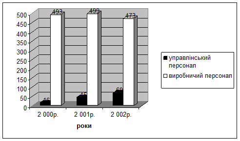 Аналізуючи дані таблиці ми спостерігаємо збільшення частки управлінського персоналу в 2002 році в порівнянні з 2000 та 2001 роками на 9.6% і 4,4% відповідно. З іншого боку, частка виробничого персоналу навпаки зменшилась у 2002 році в порівнянні з 2000 та 2001 роками на 9.6% і 4.4% відповідно. Динаміку змін у структурі персоналу можна побачити на рисунку 2.2.