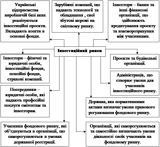 Малюнок 3 . Структура інвестиційного ринку . Щодо фінансового ринку, то на сучасному етапі розвитку економіки він займає особливе місце у фінансовому забезпеченні інвестиційного процесу. Фінансовий ринок - це механізм перерозподілу капіталу між кредиторами та заставодавцями за допомогою посередників на основі попиту та пропозиції на капітал. Фінансовий ринок є сукупністю кредитно-фінансових інститутів, що спрямовують потік грошових коштів від власників до заставодавців і назад. Головна функція фінансового ринку полягає у трансформації недіючих коштів у позиковий капітал. Структуру цього ринку представимо на малюнку 4 .