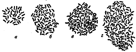 Рис.11.2. Растения и наборы хромосом в соматических клетках Solanumnigrum: а—г: 36, 72, 108 и 144 хромосомы Изоляция в процессе видообразования взаимодействует с другими элементарными эволюционными факторами. Она усиливает генотипические различия, создаваемые мутационным процессом и генетической комбинаторикой. Возникающие благодаря изоляции внутривидовые группировки отличаются по генетическому составу и испытывают неодинаковое давление отбора.