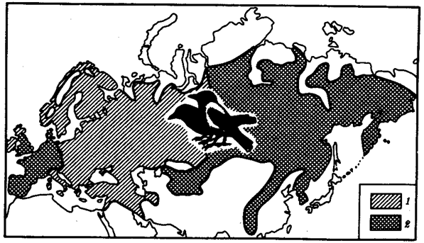 Рис. 11.3. Сниженная жизнеспособность гибридов как фактор разделения популяций серой и черной ворон: 1 — ареал серой вороны, 2 — ареал черной вороны 11.4. ЕСТЕСТВЕННЫЙ ОТБОРВ природных популяциях организмов, размножающихся половым способом, существует большое разнообразие генотипов и, следовательно, фенотипов. Благодаря индивидуальной изменчивости в условиях конкретной среды обитания приспособленность разных генотипов (фенотипов) различна. В эволюционном контексте приспособленность определяют как произведение жизнеспособности в данной среде, обусловливающей большую или меньшую вероятность достижения репродуктивного возраста, на репродуктивную способность особи. Различия между организмами по приспособленности, оцениваемой передачей аллелей следующему поколению, выявляются в природе с помощью естественного отбора. Главный результат отбора заключается не просто в выживании более жизнеспособных, а в относительном вкладе таких особей в генофонд дочерней популяции. Необходимой предпосылкой отбора является борьба за существование — конкуренция за пищу, жизненное пространство, партнера для спаривания. Естественный отбор происходит на всех стадиях онтогенеза организмов. На дорепродуктивных стадиях индивидуального развития, например в эмбриогенезе, преобладающим механизмом отбора служит дифференциальная (избирательная ) смертность. В конечном итоге отбор обеспечивает дифференциальное (избирательное ) воспроизведение (размножение ) генотипов. Благодаря естественному отбору аллели (признаки), повышающие выживаемость и репродуктивную способность, накапливаются в ряду поколений, изменяя генетический состав популяций в биологически целесообразном направлении. В природных условиях естественный отбор осуществляется исключительно по фенотипу. Отбор генотипов происходит вторично через отбор фенотипов, которые отражают генетическую конституцию организмов. Как элементарный эволюционный фактор естественный отбор действует в популяциях. Популяция является полем действия, отдельные особи — объектами действия, а конкретные признаки — точками приложения отбора. Эффективность отбора по качественному и количественному изменению генофонда популяции зависит от величины давления и направления его действия. Величину давления отбора выражают коэффициентом отбора S, который характеризует интенсивность устранения из репродуктивного процесса или сохранения в нем соответственно менее или более приспособленных форм по сравнению с формой, принятой за стандарт приспособленности. Так, если некий локус представлен аллелями A1 и А2 , то популяция по генотипам делится на три группы: A1 A1 ; A1 A2 ; A2 A2 . Обозначим приспособленность этих генотипов W0 , W1 , W2 . Выберем в качестве стандарта первый генотип, относительная приспособленность которого максимальна и равна 1. Тогда приспособленности других генотипов составят доли этого стандарта: Al A1 A1 A2 A2 A2 W0 W1 W2 или W0 /W0 = 1, W1 /W0 =l—S1 , W2 /W0 =l—S2 . Величины S1 и S2 означают пропорциональное снижение в очередном поколении воспроизводства генотипов A1 A2 и А2 А2 сравнительно с генотипом Al A1 . Отбор особенно эффективен в отношении доминантных аллелей при условии их полного фенотипического проявления и менее эффективен в отношении рецессивных аллелей, а также в условиях неполной пенетрантности. На резуль