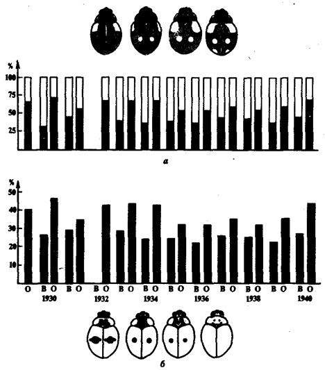 Рис. 11.7. Адаптационный полиморфизм у двухточечных божьих коровок: а— соотношение черной (зачернено) и красной форм при весеннем (В) и осеннем (О) сборе; б— частота доминантного аллеля черной окраски в весенней и осенней популяциях Балансированный полиморфизм возникает, если отбор благоприятствует гетерозиготам в сравнении с рецессивными и доминантными гомозиготами. Так, в опытной численно равновесной популяции плодовых мух Drosophila melanogaster , содержащей поначалу много мутантов с более темными телами (рецессивная мутация ebony), концентрация последних быстро падала, пока не стабилизировалась на уровне 10% (рис. 11.8). Анализ показал, что в созданных условиях гомозиготы по мутации ebony и гомозиготы по аллелю дикого типа менее жизнеспособны, чем гетерозиготные мухи. Это и создает состояние устойчивого полиморфизма по соответствующему локусу.