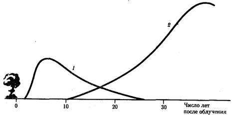 Рис. 12.1. Относительная среднестатистическая вероятность заболевания раком после однократного равномерного облучения тела дозой в 0,01 Гр в популяции людей, переживших атомную бомбардировку: 1 — лейкозы, 2 — все другие виды раковых заболеваний Хотя оценка частоты возникновения мутаций у людей встречает серьезные трудности, некоторые подходы к получению таких данных имеются. Согласно одному из них, максимальная определяемая вероятность новой мутации составляла 2,24 · 10-5 на один локус в поколении. В настоящее время давление мутационного процесса на генофонд человечества, по-видимому, усиливается благодаря росту индуцированных мутаций. Их причиной нередко служат факторы, возникающие в связи с производственной деятельностью человека в условиях научно-технической революции, например ионизирующее излучение. Подсчет прироста количества мутаций сверх фоновых значений встречается с теми же трудностями, о которых шла речь выше. Согласно ориентировочным данным, доза в 1 Гр (грей), получаемая при низком уровне радиации мужчинами, индуцирует от 1000 до 2000 мутаций с серьезными фенотипическими последствиями на каждый миллион живых новорожденных. У женщин эта цифра ниже — 900. Мутагенные факторы индуцируют мутации как в половых, так и в соматических клетках. В последнем случае результат может состоять в повышении частоты определенных заболеваний, прежде всего злокачественных опухолей. В отношении ионизирующих излучений, в частности, это лейкозы. Далее идут рак молочной железы и щитовидной железы (рис. 12.1). Численность населения планеты за обозримый исторический период в целом возросла. В эпоху неолита (10—6 тыс. лет назад) число людей было равно примерно 5 млн., в период появления городов (4,5—3,5 тыс. лет назад) — 20—40 млн., во времена Римской империи к началу новой эры — 200 млн., к 1600 г. - 500 млн., в 1800 г. -1 млрд., в настоящее время — более 6 млрд. Представляя общую тенденцию в истории человечества, эти данные указывают также на изменение во времени темпов прироста народонаселения. Этот показатель, однако, изменялся в историческом развитии неравномерно.