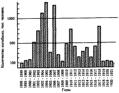 Рис. 12.2. Сокращение численности людей в средние века в связи с эпидемией чумы Моменты ускорения прироста численности людей совпадают с важнейшими достижениями человечества — развитием земледелия примерно 8000 лет назад, началом индустриализации, эрой научно-технической революции. Важным следствием увеличения темпа прироста является изменение плотности населения. Так, в эпоху охотников и собирателей (30—20 тыс. лет назад) она составляла менее 1 человека на 3 км2 , в век бронзы и железа (4—3 тыс. лет назад) — 10 человек, в настоящее время — от 4 до 900—1200 на 3 км2 . Даже сейчас 50% населения размещаются всего на 5% площади обитаемой суши. Крайне неравномерное распределение людей на Земном шаре имело место на любом этапе развития человечества. Ускорение роста численности при ограниченности заселяемой территории способствует усилению миграций. На фоне общей тенденции к повышению численности людей имели место отдельные снижения этого показателя (рис. 12.2). Причиной снижения, отраженного на диаграмме динамики населения планеты, явилась эпидемия чумы с большой смертностью, которая в средние века распространилась на значительные территории. Предполагают, что сокращение численности людей на территории Европы происходило также в начале каменного века. Причина состояла в уничтожении племенами, освоившими технику коллективной охоты, основного источника пищи — крупных травоядных животных. Заметные колебания численности на ограниченных территориях происходили вследствие, например, особо опасных инфекций. Они были закономерными явлениями в жизни целых народов еще в начале текущего столетия (рис. 12.3).