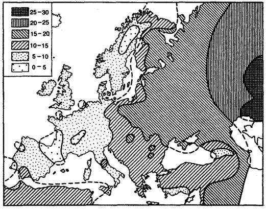 Рис. 12.4. Градиент распределения аллеля В системы группы АВО в Европе Сохранению высокого уровня генетической изоляции двух популяций, существующих на одной территории, способствуют отличия по физическим признакам или образу жизни. Однако такие барьеры со временем ослабевают. Об этом свидетельствует судьба популяций белых и негров в США и Бразилии. К настоящему времени доля генов от белых составляет у американских негров 25%, а у бразильских — 40%. Между двумя генетически различающимися популяциями, разделенными географически, иногда вклиниваются другие популяции, через которые и происходит обмен генами. В таких случаях наблюдается градиент признака. Так, частота аллеля группы крови В в Европе постепенно повышается с запада на восток (рис. 12.4). У коренного населения Пиренейского п-ова этот ген практически отсутствует, тогда как в районе Астрахани его частота достигает 30%. В настоящее время круг возможных браков неуклонно расширяется. Разрушение многовековых изоляционных барьеров — процесс, по-видимому, необратимый. 12.2.4. Генетико-автоматические процессы Предположительно человеческие популяции в палеолите состояли из нескольких сотен индивидуумов. Всего одно-два столетия тому назад люди жили преимущественно поселениями в 25—35 домов. Вплоть до самого последнего времени количество индивидуумов в отдельных популяциях, непосредственно участвующих в размножении, редко превышало 400—3500 человек. Причины географического, экономического, расового, религиозного, культурного порядка ограничивали брачные связи масштабами определенного района, племени, поселения, секты. Высокая степень репродуктивной изоляции малочисленных человеческих популяций на протяжении многих поколений создавала благоприятные условия для дрейфа генов. Генетико-автоматические процессы, или дрейф генов, приводят к сглаживанию изменчивости внутри группы и появлению случайных, не связанных с отбором различий между изолятами. Именно это выявили наблюдения за особенностями фенотипов малочисленных групп населения в условиях, например, географической изоляции. Так, среди жителей Памира резус-отрицательные индивидуумы встречаются в 2—3 раза реже, чем в Европе. В большинстве кишлаков такие люди составляют 3—5% популяции. В некоторых изолированных селениях, однако, их насчитывается до 15%, т.е. примерно как в европейской популяции. В крови человека имеются гаптоглобины, которые связывают свободный гемоглобин после разрушения эритроцитов, чем предотвращают его выведение из организма. Синтез гаптоглобина Нр1-1 контролируется геном Нр1 . Частота этого гена у представителей двух соседних племен на Севере Южной Америки составляет 0,205 и 0,895, отличаясь более чем в 4 раза. Примером действия дрейфа генов в человеческих популяциях служит эффект родоначальника. Он возникает, когда несколько семей порывают с родительской популяцией и создают новую на другой территории. Такая популяция обычно поддерживает высокий уровень брачной изоляции. Это способствует случайному закреплению в ее генофонде одних аллелей и утрате других. В результате частота очень редкого аллеля может стать значительной. Так, члены секты амишей в округе Ланкастер штата Пенсильвания, насчитывающей к середине девятнадцатого века примерно 8000 человек, почти все произошли от трех супружеских пар, им
