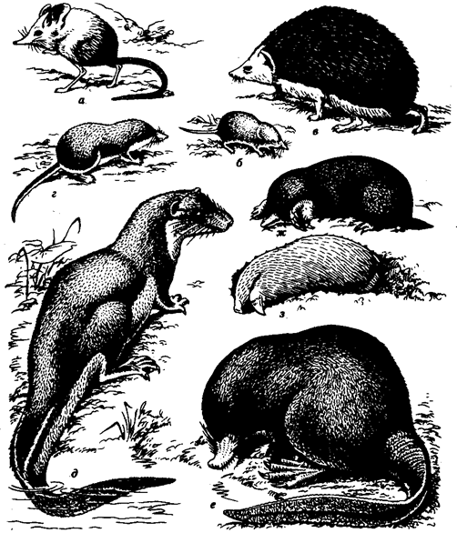 Рис. 13.1. Эволюция таксономических групп Процесс формирования таксонов надвидового ранга называют макроэволюцией. Процесс макроэволюции изучают методами палеонтологии, сравнительной анатомии и сравнительной эмбриологии. Современные методы изучения макроэволюции — иммунологический и молекулярно-биологический — подробнее описаны в § 15.2. 13.1. ЭВОЛЮЦИЯ ГРУПП ОРГАНИЗМОВГоворя о прогрессивной эволюции природы в целом и животного мира в частности, следует определить понятие уровень организации. Это понятие прямо не связано со степенью сложности строения животного. Действительно, степень сложности не только морфофизиологической организации, но и генома человека и современных человекообразных обезьян практически совпадает, но уровень организации человека несомненно выше. Предложено несколько вариантов оценки уровня организации животных. Наиболее приемлемым из них является, вероятно, определение уровня организации через характер взаимоотношения организмов данной группы со средой обитания. Примитивные организмы проявляют себя в среде пассивно. Выживание и дальнейшая эволюция их обеспечиваются в первую очередь интенсивным процессом размножения, благодаря которому компенсируются огромные потери, возникающие в процессе естественного отбора. В противоположность им высокоорганизованные организмы более активно проявляют себя в среде обитания и не только противостоят ей, но и способны преобразовывать ее, приспосабливая для своих нужд. Плодовитость их невелика. Рассмотренный критерий уровня организации может применяться только по отношению к группам организмов, связанных более или менее отдаленным родством. Так, пресмыкающиеся более высоко организованы, чем земноводные, потому, что они активнее ведут себя •в среде обитания (размножение их может происходить в разнообразных условиях), при более низкой плодовитости выживаемость их потомства значительно выше. Уровень организации млекопитающих еще более высок благодаря постоянной температуре тела, сложному поведению, внутриутробному эмбриональному развитию и заботе о потомстве. Уровень организации человека чрезвычайно высок благодаря его социальному способу адаптации к среде и активному ее преобразованию (см. гл. 17). В зависимости от того, изменяется ли уровень организации в эволюционирующих группах, выделяют два основных типа эволюции: аллогенез и арогенез. При аллогенезе у всех представителей данной группы сохраняются без изменения основные черты строения и функционирования систем органов, благодаря чему уровень организации их остается прежним. Аллогенная эволюция происходит в пределах одной адаптивной зоны — совокупности экологических ниш, различающихся в деталях, но сходных по общему направлению действия основных средовых факторов на организм данного типа. Интенсивное заселение конкретной адаптивной зоны достигается благодаря возникновению у организмов идиоадаптаций — локальных морфофизиологических приспособлений к определенным условиям существования. Пример аллогенеза с приобретением идиоадаптаций к разнообразным условиям обитания в отряде насекомоядных млекопитающих см. на рис. 13.2.