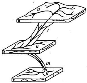 Рис. 13.3. Направления эволюции групп: I — арогенез,II — аллогенез,III — дегенерация; а, б, в — адаптивные зоны Современный органический мир характеризуется огромным многообразием форм, отличающихся как по уровню организации, так и по разнообразию локальных адаптации именно благодаря смене типов эволюции, протекающей своеобразно в каждой из эволюционирующих групп. Наряду с высокоорганизованными формами существуют примитивные, свободноживущие и паразитические организмы, возникшие эволюционно относительно недавно, и реликтовые группы, время бурного адаптационного процесса которых давно прошло. Существуют две элементарные формы филогенеза: филетическая и дивергентная эволюция. Филетическая эволюция — это изменения, происходящие в одном филогенетическом стволе, эволюционирующем во времени как единое целое. Реконструированы филогенетические ряды слона, лошади и других организмов, в которых можно наблюдать постепенное нарастание количества и степени выраженности признаков, характерных для современных форм (рис. 13.4).