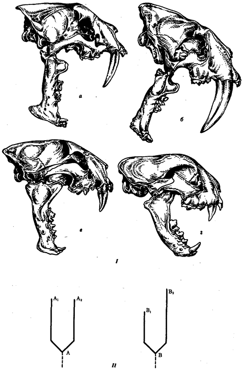 Рис. 13.7. Параллельная эволюция саблезубости у кошачьих. I — черепа саблезубых кошек в разные периоды кайнозойской эры; II— схемы параллельной эволюции: а — махайрод (олигоцен - 37-25 млн. лет назад), б — смилодон (миоцен - 25-9 млн. лет назад) в — лжесаблезубая кошка (олигоцен - 37-25 млн. лет назад), г— саблезубый тигр (плейстоцен — 1,8 млн.-10 тыс. лет назад); А-А2 — этапы синхронного параллелизма, B-B2 - этапы асинхронного 13.1.5. Эмпирические правила эволюции групп Из многочисленных обнаруженных эмпирическим путем правил и закономерностей эволюции групп остановимся на важнейших. Согласно правилу необратимости эволюции, эволюция является необратимым процессом, и организмы не могут вернуться к прежнему состоянию, уже пройденному их предками ранее. Действительно, каждое эволюционно значимое изменение представляет собой комбинацию многих мутаций и появление новых регуляторных взаимодействий, подхваченных естественным отбором, но возникших случайно и независимо друг от друга. Поэтому понятно, что возвращение генофонда данной группы организмов или даже одного генотипа к состоянию, характерному для предков, статистически практически невероятно. Однако в ряде случаев за счет отдельных обратных мутаций или за счет мутаций регуляторных генов возможно повторное возникновение отдельных признаков атавистической природы (разд. 13.3.4). Правило прогрессивной специализации утверждает, что филогенетическая группа, эволюционирующая по пути приспособления к данным конкретным условиям, и в дальнейшем будет продвигаться по пути углубления специализации. Генетические основы этого правила заключены в том, что в г«роцессе естественного отбора в условиях данной адаптивной зоны отсеиваются те гены генофондов популяций, которые не соответствуют ей. В результате возникает ограниченность способности генофондов к изменениям в разных направлениях. Примером прогрессивной специализации служат морфологические преобразования конечностей в эволюционной ветви лошадей (см. рис. 13.4). При переходе к жизни на открытых пространствах с плотной почвой у предков лошади уменьшается количество пальцев до одного, что не позволяет современным лошадям населять другие биотопы. Другой пример — эволюция Юго-Восточно-азиатских человекообразных обезьян гиббонов. Специализация их к древесному образу жизни при отсутствии хватательного хвоста, имеющегося, например, у всех американских древесных обезьян, привела к возникновению своеобразного типа движения — брахиации, при котором осуществляются прыжки по веткам в подвешенном состоянии на передних конечностях. Они при этом резко удлиняются, большой палец значительно редуцируется, а рука становится почти неспособной к манипуляциям мелкими предметами. При передвижении по земле руки гиббонов уже не участвуют в локомоции. Прогрессивная специализация резко уменьшает экологическую пластичность видов и часто является причиной их вымирания при изменившихся условиях. Уменьшение размеров и упрощение видового состава тропических лесов Индонезии являются причиной биологического регресса такого узкоспециализированного вида человекообразных обезьян, как орангутан. Следствием правила прогрессивной специализации является правило происхождения новых групп организмов от малоспециализированных предков. Примеров, иллюстр