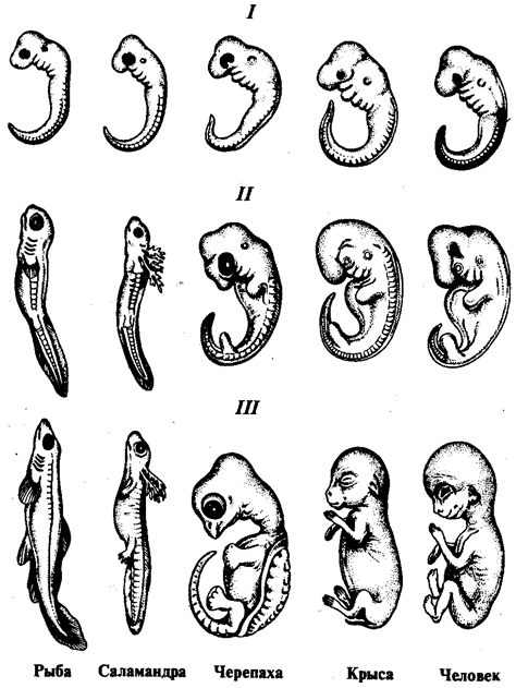 Рис. 13.8. Сходство зародышей разных классов позвоночных на разных этапах (I — Ill )онтогенеза 13.2.2. Онтогенез — повторение филогенеза Сопоставляя онтогенез ракообразных с морфологией их вымерших предков, Ф. Мюллер сделал вывод о том, что ныне живущие ракообразные в своем развитии повторяют путь, пройденный их предками. Преобразование онтогенеза в эволюции, по мнению Ф. Мюллера, осуществляется благодаря его удлинению за счет добавления к нему дополнительных стадий или надставок. На основе этих наблюдений, а также изучения развития хордовых Э. Геккель (1866) сформулировал основной биогенетический закон, в соответствии с которым онтогенез представляет собой краткое и быстрое повторение филогенеза. Повторение структур, характерных для предков, в эмбриогенезе потомков названо рекапитуляциями. Рекапитулируют не только морфологические признаки — хорда, закладки жаберных щелей и жаберных дуг у всех хордовых, но и особенности биохимической организации и физиологии. Так, в эволюции позвоночных происходит постепенная утрата ферментов, необходимых для распада мочевой кислоты — продукта метаболизма пуринов. У большинства беспозвоночных конечный продукт распада мочевой кислоты — аммиак, у земноводных и рыб — мочевина, у многих пресмыкающихся — аллантоин, а у некоторых млекопитающих мочевая кислота вообще не расщепляется и выделяется с мочой. В эмбриогенезе млекопитающих и человека отмечены биохимические и физиологические рекапитуляции: выделение ранними зародышами аммиака, позже мочевины, затем аллантоина, а на последних стадиях развития — мочевой кислоты. Однако в онтогенезе высокоорганизованных организмов не всегда наблюдается строгое повторение стадий исторического развития, как это следует из биогенетического закона. Так, зародыш человека никогда не повторяет взрослых стадий рыб, земноводных, пресмыкающихся и млекопитающих, а сходен по ряду черт лишь с их зародышами. Ранние стадии развития сохраняют наибольшую консервативность, благодаря чему рекапитулируют более полно, чем поздние. Это связано с тем, что одним из наиболее важных механизмов интеграции ранних этапов эмбриогенеза является эмбриональная индукция, а структуры зародыша, формирующиеся в первую очередь, такие, как хорда, нервная трубка, глотка, кишка и сомиты, представляют собой организационные центры зародыша, от которых зависит весь ход развития. Генетическая основа рекапитуляции заключена в единстве механизмов генетического контроля развития, сохраняющемся на базе общих генов регуляции онтогенеза, которые достаются родственным группам организмов от общих предков. 13.2.3. Онтогенез — основа филогенеза Опираясь только на основной биогенетический закон, невозможно объяснить процесс эволюции: бесконечное повторение пройденного само по себе не рождает нового. Так как жизнь существует на Земле благодаря смене поколений конкретных организмов, эволюция ее протекает благодаря изменениям, происходящим в их онтогенезах. Эти изменения сводятся к тому, что конкретные онтогенезы отклоняются от пути, проложенного предковыми формами, и приобретают новые черты. К таким отклонениям относятся, например, ценогенезы — приспособления, возникающие у зародышей или личинок и адаптирующие их к особенностям среды обитания. У взрослых организмов ценогенезы не сохра