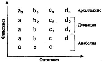 Рис. 13.9. Преобразования онто- и филогенеза в связи с возникающими филэмбриогенезами Буквами обозначены этапы онтогенеза, цифрами — филэмбриогенетические преобразования 3.Архаллаксисы — изменения, обнаруживающиеся на уровне зачатков и выражающиеся в нарушении их расчленения, ранних дифференцировок или в появлении принципиально новых закладок. Классическим примером архаллаксиса является развитие волос у млекопитающих, закладка которых наступает на очень ранних стадиях развития и с самого начала отличается от закладок других придатков кожи позвоночных (см. § 14.1). По типу архаллаксиса возникают хорда у примитивных бесчерепных, хрящевой позвоночник у хрящевых рыб (см. разд. 14.2.1.1), развиваются нефроны вторичной почки у пресмыкающихся (см. разд. 14.5.1). Ясно, что при эволюции за счет анаболии в онтогенезах потомков полностью реализуется основной биогенетический закон, т.е. происходят рекапитуляции всех предковых стадий развития. При девиациях ранние предковые стадии рекапитулируют, а более поздние заменяются развитием в новом направлении. Архаллаксисы полностью не допускают рекапитуляции в развитии данных структур, изменяя сами их зачатки. Если сопоставить схему филэмбриогенезов с таблицей К. Бэра (рис. 13.9), иллюстрирующей закон зародышевого сходства, то станет понятно, что Бэр уже был очень близок к открытию филэмбриогенезов, но отсутствие эволюционной идеи в его рассуждениях не позволило более чем на 100 лет опередить научную мысль. В эволюции онтогенеза наиболее часто встречаются анаболии как филэмбриогенезы, лишь в малой степени изменяющие целостный процесс развития. Девиации как нарушения морфогенетического процесса в эмбриогенезе часто отметаются естественным отбором и встречаются поэтому значительно реже. Наиболее редко в эволюции проявляются архаллаксисы в связи с тем, что они изменяют весь ход эмбриогенеза, и если такие изменения затрагивают зачатки жизненно важных органов или органов, имеющих значение эмбриональных организационных центров (см. разд. 8.2.6), то часто они оказываются несовместимыми с жизнью. В одной и той же филогенетической группе эволюция в разных системах органов может происходить за счет разных филэмбриогенезов. Так, в онтогенезе млекопитающих прослеживаются все этапы развития осевого скелета в подтипе позвоночных (анаболии), в развитии сердца рекапитулируют лишь ранние стадии (девиация), а в развитии придатков кожи рекапитуляции вообще отсутствуют (архаллаксис). Знание типов филэмбриогенезов в эволюции систем органов хордовых необходимо врачу для прогнозирования возможности возникновения у плодов и новорожденных врожденных пороков развития атавистической природы (см. разд. 13.3.4). Действительно, если в системе органов, эволюционирующей путем анаболии и девиаций, возможны атавистические пороки развития за счет рекапитуляции предковых состояний, то в случае архаллаксисов это исключается полностью. Кроме ценогенезов и филэмбриогенезов в эволюции онтогенеза могут обнаруживаться еще и отклонения времени закладки органов — гетерохронии — и места их развития — гетеротопии. Как первые, так и вторые приводят к изменению взаимосоответствия развивающихся структур и проходят жесткий контроль естественного отбора. Сохраняются лишь те гетерохронии и гетеротопии, которые оказываются п