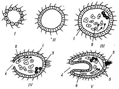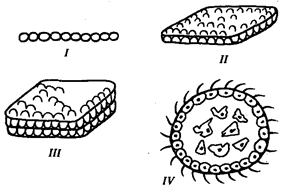Рис. 13.10. Варианты объединения клеток в надклеточные образования: I —нитевидная колония клеток, II —колония в виде однослойного пласта клеток, III —двуслойная колония клеток, IV— сферический многоклеточный организм с клетками разных типов Родоначальником многоклеточных в настоящее время считают шаровидную колонию жгутиковых, половые клетки которых перемещались в глубь колонии, а соматические первично выполняли как функцию перемещения всей колонии в пространстве, так и пищеварения за счет переваривания фагоцитированных пищевых частиц, захваченных из воды. Осуществление одной и той же клеткой функций движения и пищеварения малоэффективно. С этим связана последующая специализация клеток в направлении преимущественно пищеварения или обеспечения движения. Результатом является возникновение фагоцитобласта (внутреннего слоя амебовидных клеток, занимающихся пищеварением) и кинобласта (наружного слоя клеток со жгутиками, обеспечивающими движение). Стойкая дифференцировка соматических клеток по функциям и строению, возникшая первоначально на фоне выделения двух клеточных слоев, явилась ключевым моментом в происхождении многоклеточных. Именно с двуслойностью связано появление жидкой внутренней среды, через которую клетки обмениваются химическими сигналами, а также дальнейшее обособление и специализация части поверхностных клеток в направлении восприятия внешних раздражителей и передача возбуждения на другие клетки, располагающиеся в отдалении от них. Таким образом возникают предпосылки к формированию нервной системы. Гипотетический предок многоклеточных животных назван фагоцителлой (рис. 13.11). Он плавал в толще воды за счет биения ресничек кинобласта, а питался, захватывая взвешенные в среде частички пищи и переваривая их клетками фагоцитобласта. На более поздних этапах эволюции происходили многочисленные адаптации потомков фагоцителлы к многообразным условиям существования при оседании их на дно или при перемещении к поверхности, а также при изменении источников питания (захват мелких или крупных, живых или мертвых пищевых частиц).