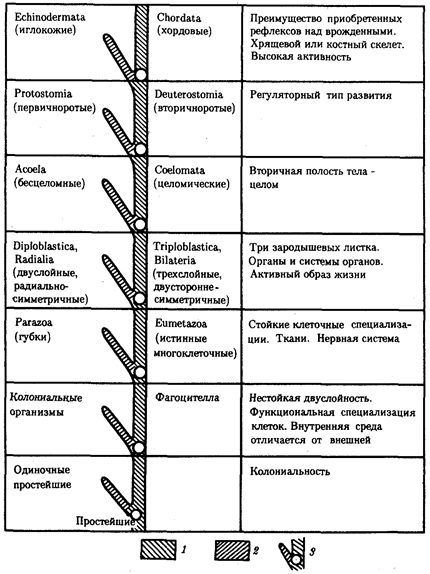 Рис. 13.12. Главные направления эволюции групп в животном царстве: 1 —прогрессивное направление, 2— адаптивное направление, 3— узловые моменты в прогрессивной эволюции; каждому узловому моменту соответствует его характеристика, обозначенная в правом столбце Существенным этапом дальнейшей эволюции многоклеточных является возникновение регуляторного типа эмбрионального развития (см. разд. 8.3.1 и 8.3.2), в результате которого в развивающемся зародыше доминирует целостность морфогенетических процессов над их составляющими. Благодаря этому зародыш развивается относительно автономно в соответствии со своей генетической программой и способен компенсировать даже серьезные повреждения. Организмы, характеризующиеся такими особенностями, относят к группе вторичноротых, в отличие от первичноротых, у которых эмбриональное развитие протекает по мозаичному типу (см. разд. 8.3.1). Наиболее крупные систематические группировки в царстве Животные называют типами. За период существования жизни на Земле их было не менее 35. К настоящему времени некоторые из них вымерли; сейчас на Земле обитают животные 26 типов. На рис. 13.12 приведена схема главных направлений эволюции в Животном царстве, а на рис. 13.13 изображены представители основных типов современных животных. Интересно, что к концу протерозойской эры (2,7 млрд. лет тому назад) на Земле уже существовали представители всех типов животного мира и основные узловые моменты в прогрессивной эволюции животных ими были пройдены. Существование разнообразных живых организмов на Земле на протяжении около 3 млрд. лет, а также возникновение человека как биосоциального существа определяет в настоящее время картину современного органического мира.
