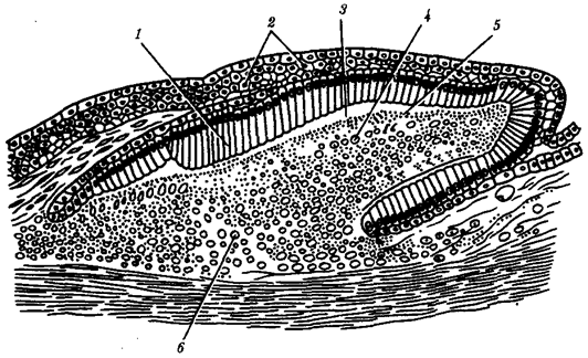 Рис. 14.1. Закладка плакоидной чешуи: 1 —клетки-эмалеобразователи, 2— эпидермис, 3— эмаль, 4— склеробласты—дентинообразователи, 5— дентин, 6— сосочек дермы Пресмыкающиеся, перешедшие полностью к наземному существованию, имеют сухую кожу, не участвующую в дыхании. Верхний слой эпидермиса ороговевает. Роговые чешуйки у некоторых рептилий тонки и эластичны, у других—сливаются вместе, образуя, как у черепах, мощный роговой панцирь. Большинство пресмыкающихся по мере роста линяют, сбрасывая периодически свой роговой покров. Современные пресмыкающиеся не имеют кожных желез. Кожные покровы млекопитающих построены наиболее сложно в связи с выполнением ими многообразных функций. Характерны различные производные кожи: волосы, когти, рога, копыта, а также потовые, сальные и млечные железы. Более примитивные млекопитающие — насекомоядные, грызуны и некоторые другие — наряду с волосяным покровом сохранили также роговые чешуи на хвосте. Волосы у них растут в промежутках между чешуйками, группами по 3—7. У более прогрессивных млекопитающих, утративших чешуи, сохраняется такое же расположение волос (рис. 14.2), покрывающих практически все тело, кроме некоторых участков, например подошв и ладоней у человека. Волосы многих млекопитающих дифференцированы на типичные, служащие для терморегуляции, и большие, или вибриссы , основания которых связаны с чувствительными нервными окончаниями. У большинства млекопитающих вибриссы расположены в области рта и носа, у приматов они редуцированы в связи с усилением осязательной функции передних конечностей, у многих яйцекладущих и сумчатых — разбросаны по всему телу. Этот факт может свидетельствовать о том, что волосяной покров предков млекопитающих первично выполнял осязательные функции, а затем, по мере увеличения количества волос, стал принимать участие в терморегуляции. В онтогенезе человека закладывается большее количество волосяных зачатков, но к концу эмбриогенеза наступает редукция большинства из них.