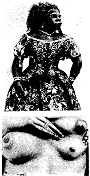 Рис. 14.5. Атавистические аномалии развития кожи. А — гипертрихоз; Б — полимастия Сальные железы образуются в коже только у млекопитающих. Их секрет, смазывая волосы и поверхность кожи, придает им несмачиваемость и эластичность. Онтогенез покровов и придатков кожи млекопитающих и человека отражает их эволюцию по типу архаллаксиса. Действительно, ни зачатки роговых чешуи, характерных для пресмыкающихся, ни более ранние формы придатков кожи в их эмбриогенезе не рекапитулируют. При этом на стадии вторичного органогенеза развиваются сразу зачатки волосяных фолликулов. Нарушения раннего онтогенеза кожных покровов человека могут вызвать возникновение некоторых малосущественных атавистических пороков развития: гипертрихоз (повышенное оволосение), полителию (увеличенное количество сосков), полимастию (увеличенное количество млечных желез) (рис. 14.5). Все они связаны с нарушением редукции избыточного количества этих структур и отражают эволюционную связь человека с наиболее близкими предковыми формами — млекопитающими. Именно поэтому у человека и других млекопитающих невозможно рождение потомства с атавистическими признаками кожных покровов, характерными для более отдаленных предков. Одним из самых известных признаков недоношенности новорожденных является повышенное оволосение кожи. Вскоре после рождения избыточные волосы обычно выпадают, а их фолликулы редуцируются. 14.2. ОПОРНО-ДВИГАТЕЛЬНЫЙ АППАРАТФилогенез двигательной функции лежит в основе прогрессивной эволюции животных. Поэтому уровень их организации в первую очередь зависит от характера двигательной активности, которая определяется особенностями организации опорно-двигательного аппарата, претерпевшего в типе Хордовые большие эволюционные преобразования в связи со сменой сред обитания и изменения форм локомоции. Действительно, водная среда у животных, не имеющих наружного скелета, предполагает однообразные движения за счет изгибов всего тела, в то время как жизнь на суше более способствует их перемещению с помощью конечностей. Рассмотрим в отдельности эволюцию скелета и мышечной системы. У хордовых скелет внутренний. По строению и функциям подразделяется на осевой, скелет конечностей и головы. 14.2.1.1. Осевой скелетВ подтипе Бесчерепные имеется только осевой скелет в виде хорды. Она построена из сильно вакуолизированных клеток, плотно прилегающих друг к другу и покрытых снаружи общими эластической и волокнистой оболочками. Упругость хорде придают тургорное давление ее клеток и прочность оболочек. Хорда закладывается в онтогенезе всех хордовых и выполняет у более высокоорганизованных животных не столько опорную, сколько морфогенетическую функцию, являясь органом, осуществляющим эмбриональную индукцию. На протяжении всей жизни у позвоночных хорда сохраняется только у круглоротых и некоторых низших рыб. У всех остальных животных она редуцируется. У человека в постэмбриональном периоде сохраняются рудименты хорды в виде nucleus pulposus межпозвоночных дисков. Сохранение избыточного количества хордального материала при нарушении его редукции чревато возможностью развития у человека опухолей — хордом, возникающих на его основе. У всех позвоночных хорда постепенно вытесняется позвонками, развивающимися из склеротомов сомитов, и функционально заме