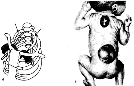 Рис. 14.7. Аномалии развития осевого скелета. А — рудиментарные шейные ребра (показаны стрелками); Б — несращение остистых отростков позвонков в грудной и поясничной областях. Спинномозговые грыжи Онтогенез осевого скелета человека рекапитулирует основные филогенетические стадии его становления: в периоде нейруляции закладывается хорда, заменяющаяся впоследствии хрящевым, а затем и костным позвоночником. На шейных, грудных и поясничных позвонках развивается по паре ребер, после чего шейные и поясничные ребра редуцируются, а грудные срастаются спереди друг с другом и с грудиной, формируя грудную клетку. Нарушение онтогенеза осевого скелета у человека может выразиться в таких атавистических пороках развития, как несрастание остистых отростков позвонков, в результате чего формируется spinabifida —дефект позвоночного канала. При этом часто через дефект выпячиваются мозговые оболочки и образуется спинномозговая грыжа (рис. 14.7). В возрасте 1,5—3 мес. зародыш человека обладает хвостовым отделом позвоночника, состоящим из 8—11 позвонков. Нарушение их редукции в последующем объясняет возможность возникновения такой известной аномалии осевого скелета, как персистирование хвоста. Нарушение редукции шейных и поясничных ребер лежит в основе их сохранения в постнатальном онтогенезе. 14.2.1.2. Скелет головыПродолжением осевого скелета спереди является осевой, или мозговой, череп, служащий для защиты головного мозга и органов чувств. Рядом с ним развивается висцеральный, или лицевой череп, образующий опору передней части пищеварительной трубки. Обе части черепа развиваются по-разному и из разных зачатков. На ранних этапах эволюции и онтогенеза они не связаны между собой, но позже эта связь возникает.