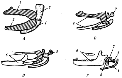 Рис. 14.9. Эволюция двух первых висцеральных жаберных дуг позвоночных. А— хрящевая рыба; Б— земноводное; В— пресмыкающееся; Г— млекопитающее: 1 —нёбно-квадратный хрящ, 2—меккелев хрящ, 3— гиомандибулярный хрящ, 4—гиоид, 5— столбик, 6— накладные кости вторичных челюстей, 7—наковаленка, 8— стремечко, 9— молоточек; гомологичные образования обозначены соответствующей штриховкой Рекапитуляция основных этапов филогенеза висцерального черепа происходит и в онтогенезе человека. Нарушение дифференцировки элементов челюстной жаберной дуги в слуховые косточки является механизмом формирования такого порока развития среднего уха, как расположение в барабанной полости только одной слуховой косточки — столбика, что соответствует строению звукопередающего аппарата земноводных и пресмыкающихся. 14.2.1.3. Скелет конечностейУ хордовых выделяются непарные и парные конечности. Непарные (спинные, хвостовой' и анальный плавники) являются основными органами передвижения у бесчерепных, рыб и в меньшей степени у хвостатых амфибий. У рыб возникают также парные конечности — грудные и брюшные плавники, на базе которых впоследствии развиваются парные конечности наземных четвероногих животных. Подробнее рассмотрим происхождение и эволюцию парных конечностей. У личинок рыб, а также у современных бесчерепных вдоль тела с обеих сторон тянутся боковые кожные складки, называемые метаплевральными (рис. 14.10). Они не имеют ни скелета, ни собственной мускулатуры, выполняя пассивную роль — стабилизацию положения тела и увеличение площади брюшной поверхности, облегчающие перемещение в водной среде. Вероятно, у предков рыб, переходящих к более активному образу жизни, в этих складках появились мышечные элементы и хрящевые лучи, связанные с сомитами по происхождению и поэтому расположенные метамерно. Такие складки, приобретя подвижность, могут выполнять роль рулей глубины, однако для изменения положения тела в пространстве большее значение имеют их передние и задние отделы, как наиболее удаленные от центра тяжести. Поэтому эволюция шла по пути интенсификации функций крайних отделов и ослабления функций центральных частей.