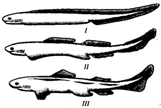 Рис. 14.10. Формирование передних и задних конечностей из метаплевральныхскладок: I —III —гипотетические этапы эволюции В результате из передних отделов складок развились грудные, а из задних — брюшные плавники (рис. 14.10). Не исключено, что формированию только двух пар конечностей на боковых сторонах тела предшествовал распад сплошных складок на ряд парных плавников, большее значение из которых также имели передние и задние. Об этом свидетельствует существование ископаемых остатков древнейших низкоорганизованных рыб с многочисленными плавниками (рис. 14.11). За счет слияния оснований хрящевых лучей возникли плечевой и тазовый пояса. Остальные их участки дифференцировались в скелет свободных конечностей.