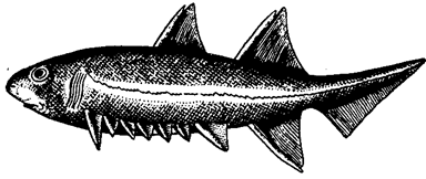 Рис. 14.11. Древняя акулообразная рыба с многочисленными парными конечностями У большинства рыб в скелете парных плавников выделяют проксимальный отдел, состоящий из небольшого числа хрящевых или костных пластинок, и дистальный, в состав которого входит большое количество расположенных радиально сегментированных лучей. С поясами конечностей плавники соединены малоподвижно. Они не могут служить опорой телу при передвижении по дну или суше. У кистеперых рыб скелет парных конечностей имеет иное строение. Общее количество их костных элементов уменьшено, и они имеют более крупные размеры. Проксимальный отдел состоит только из одного крупного костного элемента, соответствующего плечевой или бедренной костям передних или задних конечностей. Далее следуют две более мелкие косточки, гомологичные локтевой и лучевой или большой и малой берцовым костям. На них опираются 7—12 радиально расположенных лучей. В соединении с поясами конечностей у такого плавника участвуют только гомологи плечевой или бедренной костей, поэтому плавники кистеперых рыб оказываются активно подвижными (рис. 14.12, А, Б ) и могут использоваться не только для изменения направления движения в воде, но и для перемещения по твердому субстрату. Жизнь этих рыб в мелких пересыхающих водоемах в девонском периоде способствовала отбору форм с более развитыми и подвижными конечностями. Наличие у них добавочных органов дыхания (см. разд. 14.3.4) стало второй предпосылкой выхода на сушу и возникновения других адаптации к наземному существованию, результатом чего явилось происхождение земноводных и всей группы Tetrapoda. Первые их представители — стегоцефалы — обладали семи- и пятипалыми конечностями, сохраняющими сходство с плавниками кистеперых рыб (рис. 14.12, B )