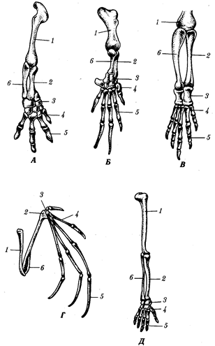 Рис. 14.13. Скелет передней конечности наземных позвоночных. А —лягушка- Б —саламандра; В —крокодил; Г —летучая мышь; Д —человек: 1 —плечевая кость, 2—лучевая кость, 3 —кости запястья, 4 —пясти, 5 —фаланги пальцев, 6 —локтевая кость