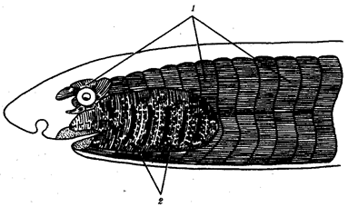 Рис. 13.14. Общий план строения хордового животного. А — вид сбоку; Б — поперечный срез: 1 —нервная трубка, 2— хорда, 3— плавники, 4— сегменты тела, 5—пищеварительная трубка, 6— пульсирующий сосуд или сердце. 7—жаберные щели в глотке, 8— целом, 9— сомит 13.5.5. Систематика типа Хордовые Из четырех подтипов хордовых — Полухордовые Hemichordata, Личиночно-хордовые Urochordata, Бесчерепные Acrania и Позвоночные Vertebrata — остановимся на двух последних, имеющих отношение к прогрессивному направлению в эволюции этого типа животных. Подтип Бесчерепные состоит лишь из одного класса — Головохордовые Cephalochordata, к которому относится ланцетник; подтип Позвоночные включает следующие классы: Круглоротые Cyclostomata, Хрящевые рыбы Chondrichthyes, Костные рыбы Osteichthyes, Земноводные Amphibia, Пресмыкающиеся Reptilia, Птицы Aves и Млекопитающие Mammalia. 13.5.6. Подтип Бесчерепные Acrania Характерной особенностью животных этого подтипа, представителем которого является ланцетникBranchiostoma lanceatum (рис. 13.15), является малоподвижный придонный образ жизни и пассивное питание за счет фильтрации воды. Тело ланцетника полупрозрачно, покрыто однослойным цилиндрическим эпителием. Дерма развита слабо. Хорда тянется от головного до хвостового конца, а нервная трубка замкнута на спинной стороне неполно. В ней расположены светочувствительные глазки Гессе, обеспечивающие ланцетнику лишь восприятие света и темноты. Около половины длины пищеварительной трубки составляет глотка, которая начинается позади ротовой полости и пронизана более чем 100 парами жаберных щелей, ведущих в околожаберную полость. Последняя открывается во внешнюю среду на брюшной стороне тела. Кишка в передней ее части снабжена печеночным выростом, гомологичным печени других хордовых, и заканчивается анальным отверстием. При поступлении воды через рот в глотку и далее в околожаберную полость осуществляется как отцеживание взвешенных в воде пищевых частиц, так и газообмен в кровеносных сосудах межжаберных перегородок. Кровеносная система замкнута. Имеется один круг кровообращения, функцию сердца выполняет пульсирующая брюшная аорта. Органы выделения — метамерно расположенные на межжаберных перегородках нефридии, состоящие из воронок, которые собирают продукты диссимиляции из целома и выводят их в околожаберную полость. Метамерно организованы и половые железы, выделяющие гаметы по мере их созревания также в околожаберную полость и далее во внешнюю среду вне зависимости от наличия поблизости половозрелых организмов противоположного пола. Данные сравнительной анатомии и эмбриологии позволяют сделать вывод о том, что предками бесчерепных были мелкие свободнопла-вающие двусторонне-симметричные существа с сегментированной мускулатурой и с небольшим количеством жаберных щелей, открывающихся наружу. Так же как и у ланцетника, питание их было пассивным и осуществлялось за счет фильтрации воды через жаберные щели, а половые продукты периодически выбрасывались в воду. Эти первичные бесчерепные дали начало двум ветвям в эволюции хордовых. Представители одной из них перешли к придонному образу жизни. От них произошли предки современных бесчерепных. Другая ветвь характеризовалась усилением двигательной активности. Арогенная эволюция в этой ветви хордовых привела к формированию подтипа Позвоночные.