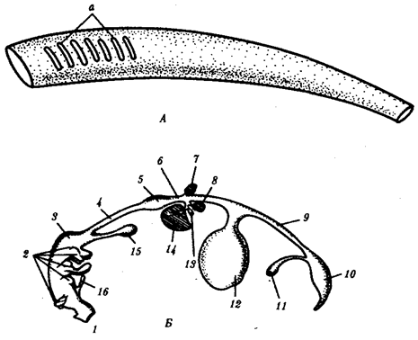 Рис. 14.18. Кишечная трубка позвоночных (А ) и ее дифференцировка в эмбриогенезе человека (Б ): а— жаберные щели в глотке;1 —ротовая полость, 2— 1—5-й глоточные карманы, 3— глотка, 4— пищевод, 5— желудок, 6— двенадцатиперстная кишка, 7—дорсальная поджелудочная железа, 8— вентральная поджелудочная железа, 9— тонкая кишка. 10 —клоака, 11— мочевой пузырь, 12— желточный мешок, 13— желчный пузырь, 14— печень,15— легкие,16 —закладка щитовидной железы Тесная связь обеих систем в филогенезе определяется в первую очередь их топографическими и динамическими координациями, а развитие в онтогенезе — морфогенетическими и эргонтическими корреляциями. Пищеварительная и дыхательная системы хордовых в эмбриогенезе закладываются вначале в виде прямой трубки, подразделяющейся на три участка. Переднюю ее часть, начинающуюся ротовым отверстием и заканчивающуюся переходом в глотку, называют stomodeum. Слизистая оболочка, выстилающая этот участок, эктодермального происхождения и в развитии связана с кожным эпидермисом и его производными (см. § 14.1). Средняя часть кишки начинается глоткой и заканчивается в том месте, где ее энтодермальная слизистая оболочка контактирует с эктодермальной слизистой оболочкой задней кишки, или proctodeum (рис. 14.18). Рассмотрим вначале эволюцию ротовой полости и ее производных. У бесчерепных ротовая полость окружена предротовой воронкой со щупальцами и частично выстлана мерцательным эпителием, который вместе с таким же эпителием глотки создает постоянный ток воды в кишечную трубку, несущую пищевые частицы и кислород. Ротовое отверстие позвоночных окружено кожными складками — губами, которые становятся подвижными только у сумчатых и плацентарных млекопитающих в связи со вскармливанием детенышей молоком. Крыша ротовой полости образована у рыб и земноводных основанием мозгового черепа, которое является первичным твердым нёбом. Хоаны земноводных открываются в их ротовую полость сразу позади альвеолярной дуги верхней челюсти. У пресмыкающихся объем ротовой полости увеличивается, и на верхнечелюстных и нёбных костях появляются горизонтальные складки, частично разделяющие ее на верхний, дыхательный, отдел и вторичную ротовую полость. Хоаны при этом несколько смещаются кзади. У млекопитающих наблюдается срастание этих складок по средней линии таким образом, что возникает сплошное вторичное твердое нёбо, полностью отделяющее друг от друга ротовую полость и полость носа. Хоаны при этом открываются в носоглотку. Этим достигается независимость функций органов ротовой полости от процесса дыхания (рис. 14.19, А— В ). До 7-й недели эмбрионального развития человека дифференцировка области stomodeum отсутствует. К концу 8-й недели происходит формирование вторичного твердого нёба за счет срастания горизонтальных костных складок. При нарушении адгезии клеток обеих складок возможно незаращение твердого нёба — порок развития, известный под названием волчья пасть (рис. 14.19, Г ). Эта аномалия имеет атавистическую природу. Доказаны генетические механизмы ее возникновения. Она сопровождает ряд хромосомных синдромов, а также наследуется изолированно, причем с разной частотой у населения разных популяций. Так, в Японии частота «волчьей пасти» равна 2,1, а в Нигерии — 0,4 случая на 1000 рождений.