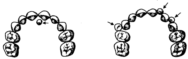 Рис. 14.20. Переход от плакоидной чешуи к зубам по краю ротового отверстия акулы: 1 — плакоидная чешуя, 2— закладка новых зубов, 3— эмаль, 4— дентин, 5— зубы Зубы млекопитающих дифференцированы на резцы, клыки и коренные. Они выполняют различные функции. Такую зубную систему называют гетеродонтной. Если резцы, и в особенности клыки, млекопитающих еще весьма сходны с коническими зубами предков, то наибольшим эволюционным преобразованиям подверглись коренные зубы. Впервые они вознили у зверозубых ящеров начала мезозойской эры за счет расширения оснований зубов и появления дополнительных бугорков, а затем и увеличения жевательных поверхностей при их сглаживании. Общее количество зубов у млекопитающих уменьшается и достигает у высших приматов 32. Зубы располагаются только на альвеолярных дугах челюстей, в ячейках. Основание зуба сужается, образуя корень. Зубы человека по сравнению с другими приматами уменьшены в размерах, особенно клыки. Моляры имеют четырехбугорчатое строение. Зубная дуга округлой формы. В связи с дифференцировкой зубов увеличилась продолжительность их функционирования, в результате чего в онтогенезе сменяются только два их поколения: молочные и коренные. Это явление называют дифиодонтизмом. У человека возможны атавистические аномалии зубной системы, связанные с нарушениями как дифференцировки зубов, так и с их количеством. Редкой аномалией является гомодонтная зубная система, в которой все зубы имеют коническую форму. Более частой патологией является трехбугорчатое строение коренных зубов. Нередко встречается прорезывание сверхкомплектных зубов в ряду или за его пределами, иногда даже на твердом нёбе (рис. 14. 21). Это свидетельствует о том, что у человека возможно образование большего количества зубных зачатков, чем 32, как это в норме встречается у низших млекопитающих и представителей более отдаленных классов позвоночных. Свидетельством тенденции к дальнейшему уменьшению количества зубов у человека является то, что нередко последние коренные зубы, так называемые «зубы мудрости», вообще не прорезываются, а если и прорезываются, то это происходит поздно — до 25 лет. Кроме того, эти зубы имеют явно рудиментарный характер, уменьшены в размерах и часто слабо дифференцированы.