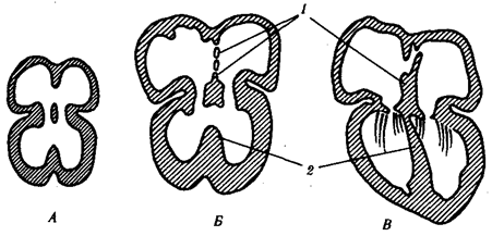Рис. 14.29. Развитие перегородок сердца у зародыша человека в возрасте 30 сут (А ) 35 сут (Б ) и 2 мес (Д): 1 —межпредсердная, 2—межжелудочковая Интересно, что место закладки и положение сердца в филогенетическом ряду позвоночных полностью рекапитулируют у млекопитающих и человека. Так, закладка сердца у человека осуществляется на 20-е сутки эмбриогенеза, как у всех позвоночных, позади головы. Позже за счет изменения пропорций тела, появления шейной области, смещения легких в грудную полость осуществляется и перемещение сердца в переднее средостение. Нарушения развития сердца могут выражаться как в возникновении аномалий строения, так и места его положения. Возможно сохранение к моменту рождения двухкамерного сердца. Этот порок совершенно не совместим с жизнью. Чаще встречаются дефекты межпредсердной перегородки (1 случай на 1000 рождений), межжелудочковой перегородки (2,5—5 случаев на 1000 рождений), вплоть до трехкамерного сердца с одним общим желудочком (см. рис. 14.31, В ). Известен и такой порок, как шейная эктопия сердца, при которой оно находится в шейной области. Этот порок связывают с задержкой сердца в области его первоначальной закладки. При этом ребенок обычно погибает сразу после рождения. Перечисленные пороки сердца наиболее часто встречаются не в изолированном виде, а в комплексе с другими аномалиями сердца, сосудов, а нередко и других органов. Это свидетельствует о том, что в морфо-генезе сердца большое значение имеют онтогенетические корреляции (см. § 13.4). Состояние больных при таких пороках зависит от того, насколько сильно нарушается гемодинамика и осуществляется смешение крови в кровеносном русле. 14.4.2. Филогенез артериальных жаберных дуг В связи с тем что основные артериальные сосуды у млекопитающих и человека формируются на базе закладок жаберных артерий, проследим их эволюцию в филогенетическом ряду позвоночных (рис. 14.30). В эмбриогенезе абсолютного большинства позвоночных закладывается шесть пар артериальных жаберных дуг, соответствующих шести парам висцеральных дуг черепа. В связи с тем что две первые пары висцеральных дуг включаются в состав лицевого черепа, две первые артериальные жаберные дуги быстро редуцируются. Оставшиеся четыре пары функционируют у рыб как жаберные артерии. У наземных позвоночных 3-я пара жаберных артерий теряет связь с корнями спинной аорты и несет кровь к голове, становясь сонными артериями. Сосуды 4-й пары достигают наибольшего развития и вместе с участком корня спинной аорты во взрослом состоянии становятся дугами аорты — основными сосудами большого круга кровообращения.