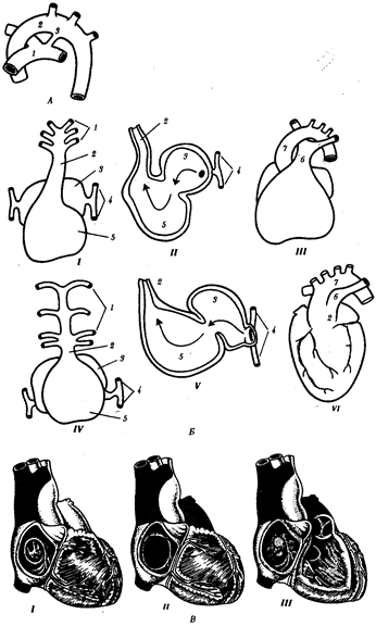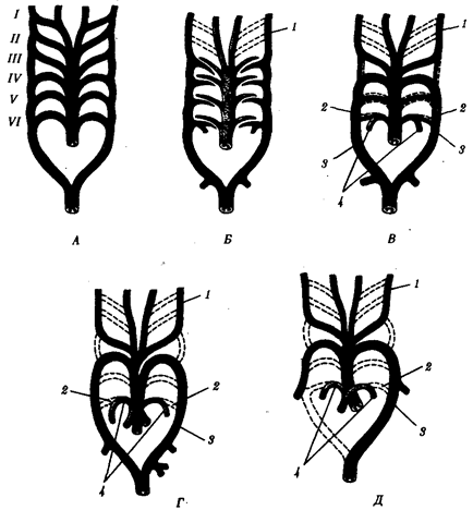 Рис. 14.30. Эволюция артериальных жаберных дуг позвоночных. А— закладка в эмбриогенезе; Б —жаберные дуги рыб; В— жаберные дуги хвостатых земноводных- Г —жаберные дуги пресмыкающихся; Д— жаберные дуги млекопитающих: I —VI - жаберные дуги; 1 —сонные артерии, 2 —боталлов проток, 3 —артериальные дуги большого круга кровообращения, 4— легочные артерии У земноводных и пресмыкающихся оба сосуда развиты и принимают участие в кровообращении. У млекопитающих также закладываются оба сосуда 4-й пары, а позже правая дуга аорты редуцируется таким образом, что от нее остается лишь небольшой рудимент— плечеголовной ствол. Пятая пара артериальных дуг в связи с тем, что она функционально дублирует четвертую, редуцируется у всех наземных позвоночных, кроме хвостатых амфибий. Шестая пара, которая снабжает венозной кровью кроме жабр еще и плавательный пузырь, у кистеперых рыб становится легочной артерией. В эмбриогенезе человека рекапитуляции артериальных жаберных дуг происходят с особенностями: все шесть пар дуг никогда не существуют одновременно. В то время, когда две первые дуги закладываются, а затем перестраиваются, последние пары сосудов еще не начинают формироваться. Кроме того, пятая артериальная дуга уже закладывается в виде рудиментарного сосуда, присоединенного обычно к 4-й паре, и редуцируется очень быстро. Из атавистических пороков развития сосудов, развивающихся из артериальных жаберных дуг, остановимся на следующих: с частотой 1 случай на 200 вскрытии детей, умерших от врожденных пороков сердца, встречается персистирование обеих дуг аорты 4-й пары. При этом обе дуги, так же как у земноводных или пресмыкающихся, срастаются позади пищевода и трахеи, образуя нисходящую часть спинной аорты. Порок проявляется нарушением глотания и удушьем. Несколько чаще (2,8 случая на 200 вскрытии) встречается нарушение редукции правой дуги аорты с редукцией левой. Эта аномалия часто клинически не проявляется. Наиболее частый порок (0,5—1,2 случая на 1000 новорожденных) — персистирование артериального, или боталлова, протока (рис. 14.31, А )представляющего собой часть корня спинной аорты между 4-й и'6-и парами артерий слева. Проявляется сбросом артериальной крови из большого круга кровообращения в малый. Очень тяжелый порок развития — персистирование первичного эмбрионального ствола, в результате которого из сердца выходит только один сосуд, располагающийся обычно над дефектом в межжелудочковой перегородке (рис. 14.31, Б ). Он обычно заканчивается смертью ребенка. Нарушение дифференцировки первичного эмбрионального ствола может привести к такому пороку развития, как транспозиция сосудов — отхождение аорты от правого желудочка, а легочного ствола — от левого, что встречается в 1 случае на 2500 новорожденных. Этот порок обычно несовместим с жизнью. Рекапитуляции проявляются и в эмбриональном развитии крупных вен человека. При этом возможно формирование атавистических пороков развития. Среди пороков развития венозного русла укажем на возможность персистирования двух верхних полых вен. Если обе они впадают в правое предсердие, аномалия клинически не проявляется. При впадении левой полой вены в левое предсердие происходит сброс венозной крови в большой круг кровообращения. Иногда обе полые вены впадают в левое предсердие. Такой порок несовместим с жизнью