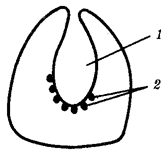 Рис 14.38. Нервная трубка ланцетника: 1 — невроцель, 2 — глазки Гессе У всех позвоночных центральная нервная система является производной нервной трубки, передний конец которой становится головным мозгом, а задний — спинным. Образование головного мозга называют кефализацией. Она связана с усилением двигательной активности позвоночных и необходимостью постоянного анализа раздражении, приходящих из внешней среды, в первую очередь с переднего конца тела. Этот процесс сопровождается также дифференциацией органов чувств, особенно дистантных — обоняния, зрения и слуха. Совместная эволюция органов чувств и головного мозга приводит к возникновению динамических координации между обонятельными рецепторами и передним мозгом, зрительными — и средним, слуховыми — и задним. Видимо, поэтому головной мозг всех современных позвоночных животных в эмбриогенезе закладывается вначале из трех мозговых пузырей — переднего, среднего и заднего — и только позже дифференцируется на пять отделов. Вероятно, предки позвоночных имели более простой головной мозг, развивающийся на основе трех мозговых пузырей. Головной мозг современных взрослых позвоночных всегда состоит из пяти отделов: переднего, промежуточного, среднего, заднего и продолговатого. Внутри головного и спинного мозга расположена общая полость, соответствующая невроцелю. В спинном мозге это спинномозговой канал, а в головном — желудочки мозга. Ткань мозга состоит из серого вещества (скопления нервных клеток) и белого (отростков нервных клеток). Во всех отделах головного мозга различают мантию, располагающуюся над желудочками, и основание, лежащее под ними. В прогрессивной эволюции головного мозга проявляется постепенное усиление роли его передних отделов и мантии по сравнению с задними и основанием. У рыб головной мозг в целом невелик. Слабо развит его передний отдел. Передний мозг не разделен на полушария. Крыша его тонкая, состоит только из эпителиальных клеток и не содержит нервной ткани. Основание переднего мозга включает полосатые тела, от него отходят обонятельные доли. Функционально передний мозг является высшим обонятельным центром. В промежуточном мозге, с которым связаны эпифиз и гипофиз, расположен гипоталамус, являющийся центральным органом эндокринной системы. Средний мозг рыб наиболее развит. Он состоит из двух полушарий и служит высшим зрительным центром. Кроме того, он представляет собой высший интегрирующий отдел головного мозга. Задний мозг содержит мозжечок, осуществляющий регуляцию координации движений. Он развит очень хорошо в связи с перемещением рыб в трехмерном пространстве. Продолговатый мозг обеспечивает связь высших отделов головного мозга со спинным и содержит центры дыхания и кровообращения. Головной мозг такого типа, в котором высшим центром интеграции функций является средний мозг, называют ихтиопсидным. У земноводных головной мозг также ихтиопсидный. Однако передний мозг их имеет большие размеры и разделен на полушария. Крыша его состоит из нервных клеток, отростки которых располагаются на поверхности. Как и у рыб, больших размеров достигает средний мозг, также представляющий собой высший интегрирующий центр и центр зрения. Мозжечок несколько редуцирован в связи с примитивным характером движений. Условия наземного существовани