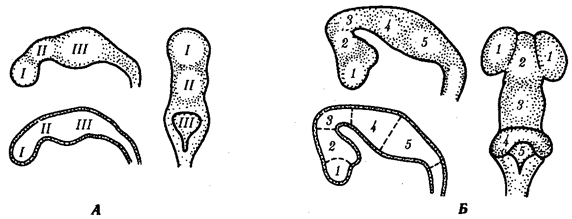 Рис. 14.39. Эволюция головного мозга позвоночных. А—рыба; Б— земноводное; В— пресмыкающееся; Г— млекопитающее: 1 —обонятельные доли, 2— передний мозг, 3— средний мозг, 4— мозжечок, 5— продолговатый мозг, 6— промежуточный мозг По мере усиления функций передних отделов головного мозга в филогенезе спинного мозга наблюдается его продольная дифференцировка с образованием утолщений в области отхождения крупных нервов к конечностям и редукция его заднего конца. Так, у рыб спинной мозг равномерно тянется вдоль всего тела. Начиная от земноводных происходит его укорочение сзади. У млекопитающих на заднем конце спинного мозга остается рудимент в виде конечной нити — filum terminale. Нервы, идущие к заднему концу тела, проходят по позвоночному каналу самостоятельно, образуя так называемый конский хвост — cauda equina. Основные этапы эволюции центральной нервной системы отражаются и в онтогенезе человека. На стадии нейруляции закладывается нервная пластинка, превращающаяся в желобок и затем в трубку. Передний конец трубки образует сначала три мозговых пузыря (рис. 14.40): передний (I ), средний (II ) и задний (III ). Вслед за этим передний пузырь подразделяется на два, дифференцирующихся на передний (7) и промежуточный (2 ) мозг — telencephalon, diencephalon. Средний мозговой пузырь развивается в средний (3) мозг — mesencephalon, a задний — в задний (4 ) мозг — metencephalon — и продолговатый (5) мозг — medulla oblongata.