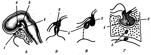 Рис. 14.42. Развитие гипофиза у человека. А— сагиттальный срез 4-недельного зародыша; Б— объединение зачатков гипофиза из стенки глотки и основания мозга; В— формирование трех долей гипофиза на 8-й неделе развития; Г —сформированный гипофиз: 1 —крыша ротовой полости, 2— основание мозга,3 —выпячивание основания мозга (задняя доля гипофиза), 4— карман Ратке (промежуточная и передняя доли гипофиза), 5— аномалия развития (добавочные дольки передней доли в стенке глотки и внутри клиновидной кости, оставшиеся в области выпячивания кармана Ратке) У хрящевых рыб во взрослом состоянии сохраняется первоначальная связь передней доли гипофиза с эпителием ротовой полости. За счет ее задней части формируется также средняя доля. Обе доли вырабатывают гонадотропные гормоны. У костных рыб и личинок земноводных имеются передняя и промежуточная доли, а у взрослых амфибий, переходящих к наземному существованию, появляется также задняя, регулирующая водный обмен. Средняя доля у них перестает выделять гонадотропный гормон, но вырабатывает пролактин. В связи с наземным образом жизни пресмыкающихся и млекопитающих у них наиболее прогрессивно развивается задняя доля гипофиза, что связано с интенсификацией водного обмена. Передняя доля вырабатывает соматотропный гормон (гормон роста) и ряд гормонов, регулирующих функции других желез внутренней секреции, а средняя — пролактин и некоторые другие. При этом усиливается дифференцировка и интенсифицируются функции ядер гипоталамуса, находящихся в функциональной связи со всеми долями гипофиза. У человека в эмбриогенезе развитие гипофиза соответствует основным этапам его эволюции. Очень часто, в 30—40%, у нормальных людей под слизистой оболочкой крыши глотки, в основании клиновидной кости, обнаруживается группа клеток длиной 5—6 мм и шириной 0,5—1 мм, по структуре и функциям соответствующая передней доле гипофиза. Это результат нарушения перемещения клеток при закладке гипофиза в эктодерме ротовой полости в области турецкого седла. Эту 139 аномалию называют эктопией аденогипофиза, она не сопровождается патологическими проявлениями. Более опасно сохранение полости в области кармана Ратке — киста кармана Ратке. Она располагается между передней и промежуточной долями, содержит слизь и в ряде случаев имеет тенденцию к росту и даже к переходу в злокачественное новообразование. Растущие кисты сдавливают гипофиз и вызывают его гипофункцию. Больные нуждаются в оперативном вмешательстве. Щитовидная железа, гормон которой — тироксин — регулирует энергетический обмен, среди хордовых как компактный орган впервые появляется у рыб. Однако уже у ланцетника отдельные тироксин-синтезирующие клетки обнаруживаются в желобке на вентральной стороне глотки. Щитовидная железа рыб закладывается также в виде желобка на вентральной стороне глотки между 1-й и 2-й жаберными щелями в области зачатка основания языка. Позже этот клеточный материал погружается под слизистую оболочку и формирует фолликулы, характерные для щитовидной железы. У других позвоночных железа закладывается так же, как у рыб, но затем она перемещается в область подъязычной кости (у земноводных) или в шейную область (у пресмыкающихся и млекопитающих). У человека в эмбриогенезе щитовидной железы происходит рекапитуляция предковых состояний. Г
