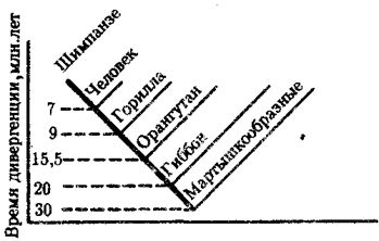 Рис. 15.2. Среднее время дивергенции высших приматов по часам ДНК