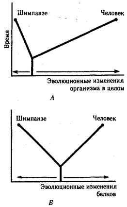 Рис. 15.3. Соотношение скорости морфофизиологической (А ) и молекулярной (Б ) эволюции Поскольку изучение хромосомного материала возможно только у ныне живущих организмов, применение цитогенетического метода ограничивается современным человеком и человекообразными обезьянами. Дифференциальная окраска хромосом позволяет не только сопоставлять хромосомы разных видов приматов и человека и изучать хромосомный полиморфизм современного человека, но и решать некоторые вопросы эволюции. Выяснено, что кариотип человекообразных обезьян отличается по количеству хромосом от кариотипа человека на одну пару (23 пары хромосом человека и 24 пары шимпанзе). У человека и шимпанзе идентичны 13 пар хромосом. Хромосома 2-й пары человека точно соответствует двум соединенным хромосомам шимпанзе, а остальные хромосомы отличаются друг от друга незначительно. Так, хромосома 5-й пары шимпанзе соответствует такой же хромосоме человека, но небольшой ее перицентрический участок инвертирован на 180° по сравнению с человеческой хромосомой. Инверсии такого рода обнаружены в кариотипах человека и шимпанзе еще в восьми хромосомах. Эти данные вместе с указаниями на сходство белков человека и шимпанзе свидетельствуют об их значительной эволюционной близости. Сопоставление кариотипов людей, происходящих из разных популяций, приводит к выводу о полиморфизме хромосом, в первую очередь по размерам гетерохроматиновых участков. Наследуемость индивидуальных вариаций хромосом и их неравномерное распределение в разных популяциях (в частности, расовые различия по размерам длинного плеча Y-хромосомы) делают возможным популяционно-цитогенетический подход в изучении эволюции современного человека. 15.3. ХАРАКТЕРИСТИКА ОСНОВНЫХ ЭТАПОВ АНТРОПОГЕНЕЗАДолгое время многие палеонтологи и антропологи считали наиболее древними представителями семейства гоминид южно-африканских двуногих приматов Australopithecus africanus. Возраст большей части южно-африканских находок австралопитеков определяется в интервале 3—1 млн. лет. Строение скелетов этих организмов свидетельствует об их прямохождении. Масса мозга — 450—550 г при общей массе тела от 25 до 65 кг. Зубная система близка к человеческой: клыки малых 146 размеров, зубы расположены в виде широкой дуги, как у человека. Это свидетельствует о всеядности. В местах обнаружения остатков австралопитеков имеется множество костей, расколотых тяжелыми предметами. Большое число черепов животных расколоты с левой стороны, и это свидетельствует о том, что австралопитеки были в основном правшами. Некоторые австралопитеки, видимо, начинали осваивать огонь. В 1960—1970-х гг. в результате раскопок в Эфиопии и позже в Танзании и Кении были обнаружены большие группы гоминид, древность которых определяется в 4—2,8 млн. лет. По этим материалам в 1978 г. был описан новый вид австралопитековA. afarensis, более примитивный, чем A. africanus, но тоже двуногий и с чертами «промежуточности» по отношению к современным человекообразным обезьянам и человеку (рис. 15.4). Объем мозговой полости черепа оказался в пределах 380—450 см3 , т.е. практически не отличался от объема мозга современного шимпанзе.