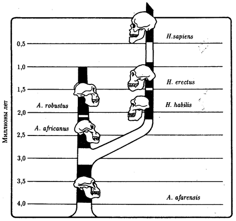 Рис. 15.4. Австралопитек афарский. Реконструкция Действительно, австалопитеки имеют большее сходство с человеком не по объему и строению мозга, а по строению зубной системы и способу передвижения. Изучение австралопитековых показало, что именно двуногость, а не большой объем мозга, явилась ключевой адаптацией ранних гоминид. В 1964 г. по находкам, сделанным в Танзании, был выделен видHomo habilis, или Человек умелый, имеющий абсолютный возраст 2—1,7 млн. лет. Отличительными чертами его являются двуногость, в целом прогрессивное строение кисти, зубной системы, объем мозговой коробки от 540 до 700 см3 , что примерно в полтора раза превышает объем мозга австралопитеков. На внутренней поверхности черепа обнаруживаются признаки прогрессивных нейроморфологических изменений, определяющиеся по отпечаткам головного мозга: выраженная асимметрия полушарий и развитие двух речевых центров как условие для возникновения членораздельной речи. Большой палец стопы не отведен в сторону. Это свидетельствует о том, что морфологические перестройки, связанные с прямохождением, у него полностью завершились. Вместе с остатками Н. habilis найдены орудия труда со следами целенаправленной обработки, свидетельствующие о ранних формах трудовой деятельности. Перечисленные признаки, ведущим из которых является прогрессивное развитие мозга, характеризуют организм уже с иной морфофункциональной организацией по сравнению с австралопитеками. Эти признаки считаются специфичными для родаHomo. Сопоставление морфологии африканского и афарского австралопитеков с Н. habilis и современным человеком позволяет предположить следующую схему филогенетических взаимоотношений ранних гоминид (рис. 15.5). Африканский австралопитек, считавшийся раньше общим предком как родаHomo, так и других австралопитековых, является в этой схеме представителем боковой ветки эволюции, приведшей к узкой специализации и образованию мощных форм типаA. robustus, которые вымерли около 1 млн. лет назад. Общим предком всех австралопитековых и родаHomo является в соответствии с этой схемойA. afarensis.