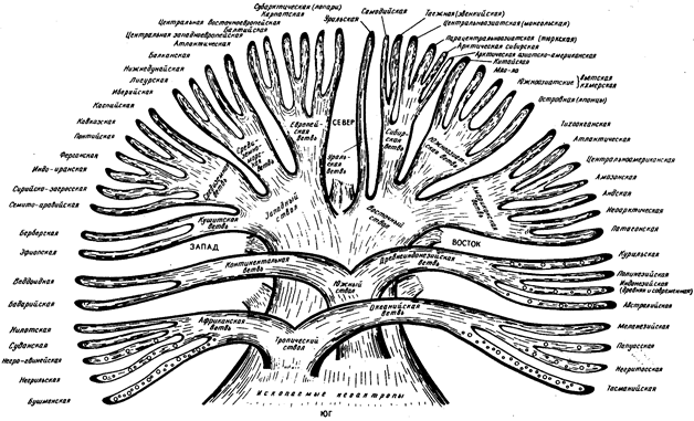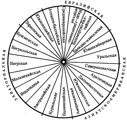 Рис. 15.7. Расовая классификация человечества без учета происхождения рас Классификация с учетом происхождения рас изображается в виде эволюционного древа с коротким общим стволом и расходящимися от него ветвями (рис. 15.8). В основе таких классификаций лежит обнаружение черт архаизма и эволюционной продвинутости отдельных рас, в соответствии с чем разные большие и малые расы занимают разное положение на ветвях такого древа. Выявление архаичных и прогрессивных черт среди морфологических признаков носит субъективный характер, благодаря чему схемы расовых классификаций такого рода очень многообразны. Но самым большим недостатком подхода к классификации рас исходя из их происхождения является попытка расположить расы на разных уровнях эволюционного древа, т.е. признание их биологической неравноценности. Кроме того, данные палеоантропологических исследований показывают, что вплоть до верхнего палеолита на территориях, обитаемых людьми, практически нигде не сформировались расовые типы человека, с которыми были бы генетически связаны современные большие расы. Это подтверждает анализ верхнепалеолитических находок скелетов людей современного физического типа из сунгирских погребений (Россия), живших приблизительно 26 тыс. лет назад. Все черепа, принадлежащие им, характеризуются мозаичным сочетанием расовых признаков и не могут быть отнесены ни к одной из современных рас. Этим данным соответствует и описание ископаемого скелета из Южной Калифорнии, пролежавшего в земле 21,5 тыс. лет и характеризующегося отсутствием выраженных монголоидных черт, несмотря на то что аборигенным населением Америки являются монголоиды. Только более поздние мезолитические находки свидетельствуют о формировании у человека расовых признаков. Так, известны мезолитические черепа с территории Северной Африки возрастом 10—8 тыс. лет с явными признаками не просто негроидной, а малой эфиопской расы. Сходные данные получены на территории Европы и в других регионах. Все это указывает на то, что процесс формирования расовых признаков — довольно поздний, идущий параллельно в разных регионах на рубеже верхнего палеолита — мезолита на фоне исходной разнородности расовых признаков у человека современного физического типа. Первичное появление на протяжении эволюции признаков малых, а не больших рас позволяет сделать вывод о том, что европеоидная, монголоидная и негроидная расы имеют мозаичное происхождение и представляют собой крупные популяции, объединенные не столько общностью происхождения, сколько климатогеографическими характеристиками условий существования и адаптивностью большинства основных признаков.