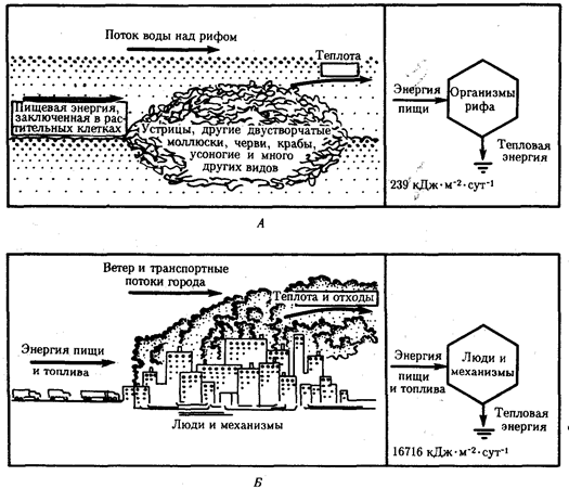 Рис. 17.2. Гетеротрофные-экологические системы. А — устричная банка; Б— современный город Следовательно, для эффективного функционирования города как экологической системы необходима более тесная связь его с окружающей средой и большая зависимость его от нее. Действительно, хотя в большинстве городов имеются мощные зеленые насаждения, органическая продукция их не играет существенной роли в снабжении города. Кислород, выделенный ими, не покрывает его расходов на дыхание людей, животных, а главное — на технологические процессы промышленных предприятий. Без постоянных поступлений пищи, строительных материалов, горючего, электричества и воды город вскоре прекратил бы существование. На рис. 17.2 представлены схемы двух экологических систем гетеротрофного типа: устричной банки и города. Обратите внимание на то, что 1 м2 городской системы потребляет в 70 раз больше энергии, чем соответствующая площадь естественного биогеоценоза; а также на более интенсивные потоки энергии и вещества на входе — выходе из системы. Площадь суши, занятая в настоящее время городами, составляет 1—5% в разных районах мира. Однако воздействие их на окружающую среду огромно. Город может влиять на окружающие его биогеоценозы не только как потребитель органического вещества и кислорода, но и как мощнейший загрязнитель, действующий нередко на огромном расстоянии. Так, продукты питания и промышленное сырье могут завозиться в города с расстояний в несколько тысяч километров. Загрязнение воздуха вредными промышленными выбросами в Центральной Европе приводит к выпадению кислотных дождей в Скандинавии, что вызывает деградацию местных лесных биогеоценозов. В США подсчитано, что для обеспечения питанием города с населением в 1 млн. человек, занимающего 259 км2 территории, необходимо около 0,8 млн. га, или 8090 км2 пашни. В слаборазвитых странах города потребляют меньше вещества и энергии, однако отсутствие в них очистных сооружений на промышленных предприятиях и для бытовых отходов приводит обычно к более сильному воздействию на окружающую природу по сравнению с городами промышленно развитых стран. Современный город сам не производит продуктов питания и других органических веществ, не обогащает воздух кислородом, почти не возвращает воду и неорганические материалы в круговорот веществ. Поэтому в широком экологическом смысле город не может считаться экологической системой. Для того чтобы рассмотреть город как биогеоценоз с характерными для него признаками устойчивости, саморегуляции и саморазвития, необходимо расширить его границы с учетом тех близких и отдаленных сред, которые определяют его жизнеобеспечение. Поэтому изучение экологических проблем городов необходимо вести не только в самих городах, но и далеко за их пределами. 17.3.2. Город как среда обитания людей Для современного состояния развития человеческого общества характерна интенсивная урбанизация. Растет количество жителей больших городов. В странах с высокой плотностью населения происходит слияние соседних городов и образование обширных территорий с высоким уровнем урбанизации — мегаполисов. Условия жизни в городах своеобразны: с одной стороны, в городе легче решаются проблемы трудоустройства, снабжения продуктами питания, медицинского обслуживания, с другой — в городах наиболее выра