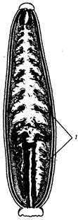 Рис. 18.6. Пищеварительная система пиявки: 1 – слепые выросты кишечника Паразиты, питающиеся кровью (представлены в основном членистоногими), имеют колюще-сосущий ротовой аппарат, а также сильно растяжимый хитиновый покров, часто разветвленную пищеварительную трубку (рис. 18.6), антикоагулянтные свойства слюны и консервантные свойства ферментов пищеварительной системы. Эндопаразиты, активно отыскивающие хозяина, обладают органами ориентации в среде, используемыми для поисков хозяина (светочувствительные глазки, термо- и хеморецепторы), и органами передвижения (рис. 18.7). Передний конец тела паразитов, внедряющихся в организм хозяина, снабжен органами проникновения — специализированными железами, колющими стилетами и т.д. Это касается даже некоторых простейших, способных проникать в ткани хозяина через неповрежденные покровы. Все паразиты, развивающиеся со сменой хозяев, используют в качестве таковых виды, связанные между собой непосредственными пищевыми взаимоотношениями или обитающие с ними в одной среде. Большинство промежуточных хозяев являются источником питания для основных. Другой распространенный путь попадания паразита в организм хозяина — это использование многочисленных переносчиков, которые обеспечивают не только постоянную циркуляцию паразитов в экологических системах, но и их широкое расселение. Высшей степенью адаптации паразитов к хозяевам является наблюдаемая часто полная зависимость паразита от жизнедеятельности хозяев. При этом паразит нередко вызывает такие реакции хозяина, которые обеспечивают максимальную вероятность заражения последнего. Так, самки остриц, откладывая яйца в области анального отверстия, вызывают зуд. Расчесывание зудящих мест способствует распространению яиц этого паразита руками по окружающим предметам. Таким же образом обеспечивается расселение чесоточного клеща. Зуд в пораженной конечности, прекращающийся от соприкосновения с водой, способствует циркуляции в природе такого паразита, как ришта. Высокая температура больных паразитарными заболеваниями, распространяющимися с помощью кровососущих членистоногих, привлекает переносчиков нередко с больших расстояний и также оказывается полезной для паразитов. Нередко особенности жизнедеятельности паразитов оказываются синхронизированными с образом жизни хозяев. Так, откладка яиц шистосомами происходит обычно в самое жаркое время суток, когда наиболее вероятным оказывается контакт хозяев с водой, куда для развития должны попасть яйца этих паразитов. В это же время в поверхностных слоях воды скапливаются в поисках хозяев церкарии этих шистосом. Таким образом облегчается циркуляция паразита сразу на двух стадиях его жизненного цикла (см. разд. 20.1.1.2). Если в циркуляцию паразита включены несколько хозяев, то наблюдаются их взаимные адаптации, оказывающиеся выгодными паразитам и обеспечивающие его эффективное развитие. Так, выход микрофилярий в кровеносные сосуды человека происходит в часы суток, соответствующие периоду максимальной активности кровососущих насекомых, являющихся их переносчиками (см. разд. 20.2.1.2).