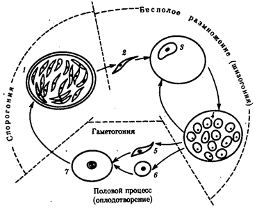 Рис. 19.6. Пневмоцистис. А — паразиты (о) на клетках эпителия альвеол (б); Б — цикл развития: 1—4 — паразиты в процессе деления, 5—7 — образование спор Обнаружить Р. carinii в мокроте больных оказывается крайне сложно. Поэтому для диагностики используют иммунологические методы, которые не обладают высокой специфичностью. В настоящее время разработан метод диагностики пневмоцистоза с использованием генетических зондов. У погибших больных диагноз ставят на основании обнаружения паразитов на разных стадиях их жизненного цикла в гистологических срезах легких. Профилактика пневмоцистоза сложна в связи с широкой распространенностью паразита у здоровых людей и домашних животных. Поэтому эффективной мерой профилактики является только вакцинация людей с иммунодефицитом специальными вакцинами, получаемыми методами генетической инженерии. 19.3. Простейшие, обитающие в тканяхПростейшие, обитающие в тканях, являются более специализированными паразитами по сравнению с предыдущей группой организмов. В связи с этим у большинства из них, особенно живущих внутрикле-точно, обнаруживаются признаки глубокой дегенерации: исчезают орга-неллы передвижения и питания, форма тела становится непостоянной, поглощение питательных веществ осуществляется всей поверхностью тела за счет пиноцитоза и активного транспорта через мембраны. На протяжении эволюции у них выработались адаптации к проникновению в организм хозяина разными способами, к перемещению в тканях. Многие из них инвазируют хозяина трансмиссивным путем, другие используют промежуточных хозяев, которыми питаются основные. Циклы развития большинства простейших этой группы сильно усложняются и часто являются лабильными: в ряде случаев возможным становится заражение одного промежуточного хозяина от другого, минуя основного. Часть паразитов этой группы адаптировалась к человеку не только как к биологическому, но и как к социальному существу, используя такие необычные факторы заражения, как хирургический инструмент и медицинские манипуляции. Длительный контакт этих паразитов с иммунной системой хозяина выработал своеобразные адаптации к. избеганию действия иммунитета хозяина: наиболее специализированные паразиты этой группы обитают не просто в тканях, а внутри клеток, в том числе даже в клетках иммунной системы. Другие, находящиеся в тканевой жидкости, в межклеточных пространствах и плазме крови, вынуждены на протяжении всего онтогенеза постоянно подвергаться действию гуморальных факторов иммунитета. В результате у них возникли своеобразные особенности клеточной поверхности, выражающиеся в том, что постоянно меняется ее антигенный состав. Простейших, обитающих в тканях, следует подразделить на передающихся нетрансмиссивно и передающихся трансмиссивно. 19.3.1. Простейшие, обитающие в тканях и передающиеся нетрансмиссивно К этой группе простейших относятся близкие друг другу виды кокцидий (кл. Споровики), ведущих внутриклеточный образ жизни. Они паразитируют не только у человека, но и у большого количества видов домашних и диких животных. Таким образом, вызываемые ими заболевания являются зоонозными и природно-очаговыми, профилактика которых осложнена. Не менее сложна и диагностика, что связано, с одной стороны, со слабой выраженностью симптомов заболеваний, а с другой — 