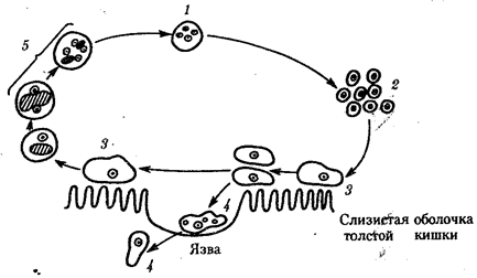 Рис. 19.3. Простейшие, обитающие в тонкой и толстой кишках. А — лямблия; Б — дизентерийная амеба; В — кишечная амеба; Г — кишечная трихоманада; Д— балантидий кишечный: а — трофозонты, б — цисты Трофозоиты используют питательные вещества с поверхности клеток кишечного эпителия. Захват пищи осуществляется пиноцитозом. Большие количества лямблии, которые покрывают обширные поверхности кишечной стенки, нарушают процессы всасывания и присте-ночного пищеварения. Попадая в нижние отделы тонкой кишки, лямблии инцистируются. Зрелые цисты имеют овальную форму, четыре ядра и несколько аксостилей. Во внешней среде цисты сохраняют жизнеспособность в течение нескольких недель. Заражение человека происходит при проглатывании цист. Лабораторная диагностика — обнаружение цист в фекалиях и тро-фозоитов в содержимом двенадцатиперстной кишки, полученном при дуоденальном зондировании. Личная профилактика — соблюдение правил гигиены питания. Общественная профилактика — санитарное благоустройство туалетов, предприятий общественного питания. 19.2.3. Простейшие, обитающие в толстой кишке Толстая кишка очень благоприятна для обитания простейших. Паразиты располагаются вблизи слизистой оболочки, в слизи, покрывающей эпителий крипт. Большинство этих простейших являются комменсалами, питаясь бактериями и слущенными клетками кишечника. Два вида простейших — дизентерийная амеба и балантидий — патогенны, но в организме здорового человека они могут долгое время вести комменсальный образ жизни. Дизентерийная амеба Entamoeba histolylica (кл. Саркодовые) — возбудитель амебиаза (рис. 19.3, Б ). Амебиаз встречается повсеместно, но чаще в зонах с влажным жарким климатом. В цикле развития амебы имеется несколько стадий, морфологически и физиологически отличающихся друг от друга. Мелкая вегетативная форма обитает в просвете кишки. Размеры ее 8—20 мкм. В цитоплазме можно обнаружить бактерии и грибки — элементы микрофлоры кишечника. Крупная вегетативная форма также обитает в просвете кишки в гнойном содержимом язв кишечной стенки. Ее размеры — до 45 мкм. Цитоплазма четко разделена на прозрачную, стекловидную эктоплазму и зернистую эндоплазму. В ней расположены ядро с характерной темно окрашенной кариосомой и эритроциты, которыми она питается. Крупная форма энергично передвигается с помощью широких псевдоподий. В глубине пораженных тканей располагается тканевая форма. Она мельче крупной вегетативной формы и не имеет в цитоплазме эритроцитов. Цисты обнаруживаются в фекалиях хронически больных и паразитоносителей, у которых заболевание проходит бессимптомно. Цисты имеют округлую форму диаметром 8—15 мкм и от одного до четырех ядер в виде колечек. Жизненный цикл паразита сложен (рис. 19.4). Человек заражается амебиазом, проглатывая цисты паразита с водой или пищевыми продуктами, загрязненными землей. В просвете толстой кишки из цисты образуется, за счет следующих друг за другом делений, восемь мелких клеток, превращающихся в мелкие вегетативные формы. Вреда человеку они не приносят. Они могут вновь инцистироваться и выходить наружу. При ухудшении условий существования хозяина мелкие вегетативные формы способны превращаться в крупные, которые вызывают образование язв. Погружаясь глубже, они превращаются в тканевые формы, которые в особо тяжелых случаях мог