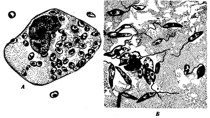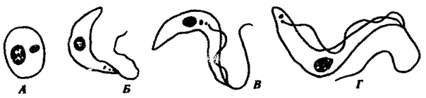 Рис. 19.9. Трипаносома. Безжгутиковая (А ) и жгутиковые {Б—Г ) формы Переносчиками являются триатомовые клопы pp. Triatoma, Rhodnius иPanstrongylus (см. разд. 21.2.2). В них трипаносомы размножаются и достигают состояния инвазионности, поступая в заднюю кишку. Вскоре после кровососания клопы испражняются на покровы человека или животного и трипаносомы проникают в кровь через раневое отверстие от хоботка или через неповрежденные слизистые оболочки губ, носа и глаз. Окончательными хозяевами кроме человека являются броненосцы, опоссумы, крысы, обезьяны и домашние животные — собаки, кошки и свиньи. Болезнь поражает в основном детей младшего возраста, у которых протекает остро. В старшем возрасте заболевание переходит в хроническую форму. Патогенное действие выражается в поражении органов, в клетках которых развиваются паразиты: характерны миокардиты, кровоизлияния в мозговые оболочки и менингоэнцефалит. Иногда заболевание протекает легко и заканчивается самопроизвольным излечением. Диагностика — в острой форме заболевания возможно обнаружение трипаносом в крови. При хроническом течении рационально введение крови больного морским свинкам, у которых они обнаруживаются в большом количестве на 14-е сутки. Существует еще и своеобразный метод диагностики — кормление на больном неинвазированных переносчиков-клопов, в кишечнике которых трипаносомы быстро размножаются и легко обнаруживаются. Применяют также и методы иммунодиагностики. Трипаносомы представляют большой интерес не только потому, что способны вызывать у человека серьезные, смертельно опасные заболевания. Колоссальная экологическая пластичность, обеспечивающая им эффективное паразитирование в организме хозяина на протяжении нескольких лет, в условиях постоянно действующих механизмов иммунитета, позволяет этим паразитам осваивать и новых хозяев. Так, описанная в последние годы вспышка трипаносомоза в Эфиопии была вызвана адаптацией к человеку Т.b. brucei — подвида, паразитирующего обычно только у крупного рогатого скота и антилоп. Та же причина, вероятно, лежит в основе существования вспышек трипаносомозов в Индии и Малайзии, где у больных были выделены паразиты, обитающие обычно в крови грызунов и низших обезьян. В Центральной и Южной Америке кроме Т. cruzy известна и еще одна трипаносома — Т. rangeli, которая чаще паразитирует у кошек и собак, но способна инвазировать и человека, вызывая у него нетяжелую, быстро проходящую лихорадочную реакцию. Малярийные плазмодии Plasmodium (кл. Споровики) — возбудители малярии. Известны следующие виды малярийных плазмодиев, паразитирующие у человека: Р. vivax — возбудитель трехдневной малярии, Р. falciparum — возбудитель тропической малярии, Р. malariae — возбудитель четырехдневной малярии, Р. ovale— возбудитель овале-малярии, близкой к трехдневной. Три первых вида широко распространены в тропических и субтропических климатических поясах, последний — только в тропической Африке. Все виды сходны морфологически и жизненными циклами, отличаясь друг от друга деталями строения и некоторыми особенностями цикла развития, проявляющимися в основном продолжительностью его отдельных периодов. Жизненный цикл малярийных плазмодиев типичен для споровиков, включая стадии бесполого размножения в виде шизогонии, полового процесса и спорогонии. Окончательным хозяином п