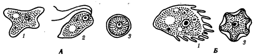 Рис. 19.1. Цикл развития споровиков: 1 — спорозоиты под оболочкой цисты, 2 — спорозоит, 3 — паразит в клетке хозяина, 4 — дочерние паразиты в клетке хозяина, 5 и 6 — мужская и женская гаметы, 7 — зигота 19.2. Простейшие, обитающие в полостных органах, сообщающихся с внешней средойПростейшие, относящиеся к этой экологической группе, став паразитами, не претерпели глубокой дегенерации в связи с тем, что условия их обитания относительно мало отличаются от внешней среды. Большинство этих паразитов анаэробны. Циклы их развития просты: у многих имеются стадии трофозоита и цисты. Некоторые не образуют и цист. Заражение большинством этих паразитов осуществляется путем проглатывания цист или трофозоитов. В их распространении большое значение имеют насекомые — механические переносчики возбудителей. Диагностика соответствующих заболеваний основана на обнаружении цист или трофозоитов в выделениях из пораженных органов. В профилактике заражения основное значение имеет соблюдение правил личной гигиены. Многие виды, живя в просвете пищеварительной трубки и других органов и находя там благоприятную среду, являются комменсалами. Однако в будущем возможно усиление степени их контакта с хозяином и переход к паразитированию. 19.2.1. Простейшие, обитающие в полости рта Ротовая амеба Entamoeba gingivalis (кл. Саркодовые) — комменсал, обитающий на деснах, зубном налете и в криптах нёбных миндалин более чем у 25% здоровых людей (рис. 19.2, А ). У лиц с заболеванием полости рта встречается чаще. Размеры клетки 6—30 мкм, псевдоподии широкие. Питается бактериями и лейкоцитами, при кровотечении из десен может захватывать и эритроциты. Цист не образует.
