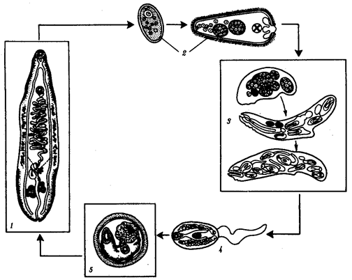Рис. 20.2. Цикл развития сосальщиков: 1 —половозрелая форма в окончательном хозяине, 2— яйцо и мирацидий в воде, 3— личинки, размножающиеся партеногенетически в моллюске, 4— церкарий в воде, 5— метацеркарий во втором промежуточном хозяине В первом случае церкарий либо самостоятельно внедряются в кожу хозяина, либо, инцистируясь на растениях, оказываются проглоченными травоядными животными или человеком. Во втором случае церкарий отыскивают животных, использующихся основными хозяевами для питания, и образуют в них покоящиеся стадии — инцистированные метацеркарий. Церкарий в отличие от мирацидиев не обладают хемотаксисом, а использование только гео- и фототаксиса, а также инцистирование на траве не позволяют им находить специфичных хозяев. Поэтому основная масса церкариев погибает либо не найдя хозяев вообще, либо попав в организмы таких видов, развитие в которых невозможно. После проникновения инвазионных стадий сосальщиков в основного хозяина они мигрируют у него в организме и находят тот орган, где достигнут половой зрелости и будут обитать всю последующую жизнь. Отсутствие свободноживущих видов в классе Сосальщики на фоне общего примитивизма их организации, сложный цикл развития, в котором участвуют специфические промежуточные и основные хозяева, огромная плодовитость, достигающаяся разными способами размножения, и сохранившаяся связь с водной средой обитания свидетельствуют о древности паразитического образа жизни этих организмов. Среди хозяев сосальщиков наиболее специфичными являются именно моллюски: для каждого вида паразита, обитающего на стадии мариты нередко у нескольких видов основных хозяев, первым промежуточным хозяином практически всегда является только один вид улиток. Это означает, что на протяжении эволюции между сосальщиками и моллюсками возникли наиболее совершенные взаимные адаптации. Моллюски были, вероятно, первыми и единственными хозяевами сосальщиков еще в период, предшествующий возникновению позвоночных. Об этом свидетельствует также сохранившийся в цикле развития сосальщиков партеногенез — рудиментарная форма полового размножения, — проходящий именно в организме моллюсков. Наряду с этими чертами в цикле развития имеются такие признаки, которые указывают на рекапитуляции свободного образа жизни: обязательный выход яиц во внешнюю среду и наличие активно плавающих расселительных стадий с органами чувств — мирацидиев и церкарий. Возникновение и дальнейший биологический и морфофизиологи-ческий прогресс позвоночных, освоивших все благоприятные для жизни среды, открыли и сосальщикам широкие возможности адаптивной эволюции за счет приспособления к новым хозяевам. Адаптации сосальщиков к позвоночным как к новым средам обитания не ограничились только использованием их широкого видового разнообразия. Сосальщики адаптировались к обитанию в самых разнообразных органах, тканях и системах — от кожных покровов и органов чувств до кровеносных сосудов внутренних органов. Однако большинство сосальщиков-паразитов человека обитает в пищеварительной системе; некоторые виды живут в легких, другие — в кровеносных сосудах брюшной полости и малого таза. Человек заражается сосальщиками в зависимости от вида разными способами: при контакте с водой и проникновении церкарий через к