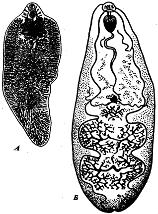 Рис. 19.12. Факультативные паразиты человека. А — Naegieria sp.; Б — Acanthamoeba sp.: 1 , 2 — вегетативные стадии, 3 — цисты Амебы р. Naegieria в организм человека попадают при купании в грязной воде через носовую полость и проникают в мозговые оболочки. Здесь амебы размножаются и вызывают острый менингоэнцефалит, который почти всегда заканчивается смертью. Наиболее часто поражаются дети. Амебы р.Acanthamoeba образуют устойчивые цисты, которые попадают в организм человека не только через носоглотку и пищеварительную систему, но и при вдыхании, а также через травмированную кожу и роговицу. Заболевание проявляется по-разному в зависимости от путей попадания возбудителя в организм. Характерным является образование гранулем, содержащих амеб. У ослабленных больных и детей заболевание заканчивается менингоэнцефалитом и смертью. ГЛАВА 20МЕДИЦИНСКАЯ ГЕЛЬМИНТОЛОГИЯМедицинская гельминтология изучает паразитов человека из группы червей. Черви— это многоклеточные, трехслойные, первичноротые, двусторонне-симметричные животные. Их тело имеет удлиненную форму, а кожно-мускульный мешок состоит из гладких или поперечно-полосатых мышц и покровных тканей. Черви — паразиты человека, относятся к типам Плоские и Круглые черви. Заболевания, вызываемые гельминтами, называют гельминтозами. В большинстве случаев при одноразовой инвазии нарастания численности гельминтов в организме хозяина не. происходит: для успешного протекания циклов их развития необходима смена сред обитания. Из этого следует, что продолжительность заболевания часто определяется продолжительностью жизни паразита и колеблется от нескольких недель при энтеробиозе до нескольких десятков лет при шистосоматозах. Тяжесть заболевания зависит от количества паразитов, попавших в организм хозяина, и его индивидуальной чувствительности. Гельминты могут обитать у человека практически во всех органах. В соответствии с этим различны пути проникновения их в организм человека, симптоматика заболеваний и методы диагностики. На протяжении длительной эволюции при переходе к паразитизму у гельминтов возникли не только признаки общей дегенерации и адаптации к паразитическому образу жизни общего значения (особые покровы, мощная половая система), но и конкретные приспособления к обитанию в определенных органах. Хозяева, в свою очередь, приобрели соответствующие адаптации, обеспечивающие стабильное существование системы хозяин — паразит. Однако во многих случаях для попадания в определенный орган гельминты осуществляют миграцию по кровеносным сосудам или непосредственно через ткани и могут попасть в другие органы. Тогда говорят об атипичной, или эктопической, локализации. Заболевание при этом протекает тяжелее, диагностируется с трудом и часто может заканчиваться гибелью одного из компонентов системы: паразита или хозяина. Сказанное в полной мере относится и к видовой специфичности системы паразит — хозяин: гельминты, адаптированные только к человеческому организму, обусловливают более легкое течение заболевания у него, чем специфические паразиты животных, попадающие к человеку случайно. 20.1. ТИП ПЛОСКИЕ ЧЕРВИ PLATHELMINTHESПлоские черви имеют тело, уплощенное в дорсовентральном направлении. Полость тела отсутствует, внутренние органы погружены в рыхлую соединительную ткань — паренхиму. Кожно-му