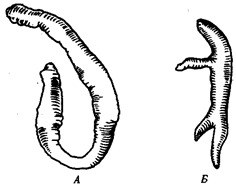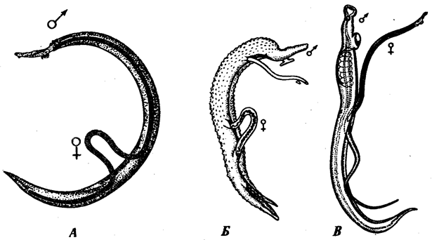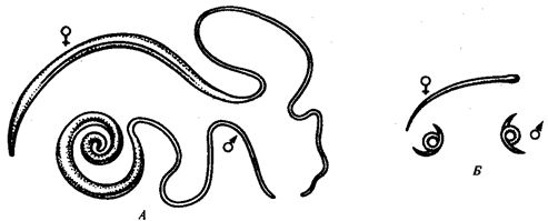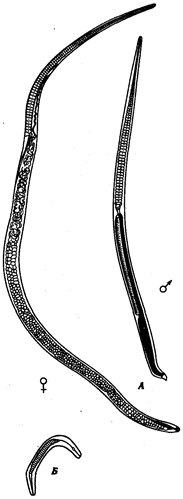 Рис. 20.15. Анкилостомиды. А — общий вид; Б— ротовой аппарат: а — Кривоголовка, 6 — некатор Эта особенность обеспечивает возможность существования подземных очагов анкилостомидозов в шахтах, находящихся в зонах умеренного пояса. Основным условием возникновения таких очагов является высокая влажность грунта и загрязненность его фекалиями. Попав в кровь, личинки проделывают по сосудам путь, характерный для всех видов гельминтов этой группы. Окончательная локализация — двенадцатиперстная кишка, к ворсинкам которой они прикрепляются ротовыми капсулами, повреждая их и питаясь кровью и клетками слизистой оболочки. Оба паразита выделяют в ранки антикоагулянтные вещества и могут вызвать кишечные кровотечения и аллергизацию больных. Лабораторная диагностика — как при всех геогельминтозах. Профилактика — кроме общих мер, описанных выше, обязательное ношение обуви в районах, где распространены эти заболевания. Угрица кишечная Strongyloides stercoralis — возбудитель стронгилоидоза. Это очень мелкий гельминт, до 2,2 мм длиной. Из всех известных паразитов человека — наименее специализированный. Жизненный цикл этого червя характеризуется значительной вариабельностью. Он может проходить целиком во внешней среде либо частично или полностью в организме хозяина. Чаще встречается чередование свободноживущего и паразитического поколений. Паразитические половозрелые угрицы живут в кишечнике человека. Из яиц уже в кишечнике выходят личинки, судьба которых может быть двоякой. В первом случае после линьки в почве они могут стать инвазионными и проникают в организм человека либо через кожу, либо перорально с фруктами и овощами. Дальнейшее развитие в этом случае проходит так же, как у анкилостомид. Во втором случае личинки могут достичь половозрелости в почве. Взрослые самки откладывают яйца и дают начало свободноживущим поколениям. При изменении условий жизни личинки могут стать инвазионными для человека и вновь перейти к паразитическому существованию. Присутствие паразитов в кишечнике вызывает чередующиеся поносы и запоры. Часто при этом паразиты заселяют и жёлчные ходы печени, вызывая желтуху. Аллергизация организма при стронгилоидозе очень сильна, особенно на миграционной стадии развития. Описаны случаи течения стронгилоидоза в течение 25 лет. Это объясняется не только длительностью жизни этого паразита,но ивозможностью аутоинвазии. Как и анкилостомиды, угрица кишечная встречается в основном в тропической и субтропической зонах. Особенно широко расселена в Юго-Восточной Азии, Южной и Центральной Америке. Возможно существование подземных очагов в зонах с умеренным климатом, как и при анкилостомидозах. При диагностике надежным признаком заболевания является обнаружение живых личинок в фекалиях, рвотных массах и при дуоденальном зондировании. Профилактика стронгилоидоза соответствует профилактике анкилостомидозов. 20.2.1.2. Круглые черви — биогельминтыВсе нематоды этой группы, поражающие человека, живородящи и большую часть цикла развития проводят у человека в тканях внутренней среды. Промежуточные хозяева их очень разнообразны — от циклопов и насекомых до медведей и человека. Окончательными хозяевами могут быть различные дикие и домашние животные, поэтому заболевания, которые вызывают эти паразиты, относятся к разряду приро