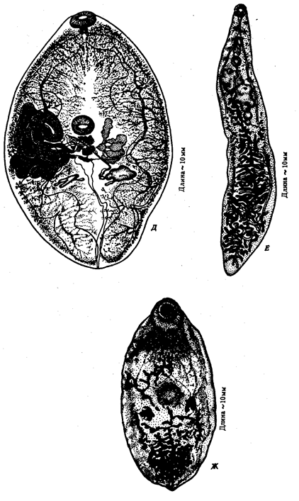 Рис. 20.5. Сосальщики, имеющие двух промежуточных хозяев. А— Metagonimusjokogawai, Б— Nanophyetes salmincola; В— кошачий сосальщик; Г— клонорхис китайский; Д— легочный сосальщик; Е— ланцетовидный сосальщик; Ж— сосальщик поджелудочной железы Указаны средние размеры паразитов