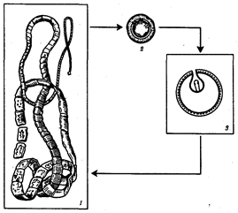 Рис. 20.11. Карликовый цепень Гименолепидоз встречается повсеместно, особенно в странах с сухим и жарким климатом. Поражаются преимущественно дети. Жизненный цикл этого паразита за время длительной адаптации к организму человека претерпел существенные изменения. Если его яйца, выделившись из организма с фекалиями, попадают в пищеварительную систему мучного хруща из р.Tenebrio, в нем разовьется финнозная стадия червя — цистицеркоид. При проглатывании инвазированного жука с непропеченным тестом в кишечнике человека из цистицеркоидов разовьются взрослые паразиты. В современных условиях такое явление происходит крайне редко. Если человек проглотит яйца карликового цепня при несоблюдении правил личной гигиены, то в ворсинках тонкого кишечника из них развиваются цистицеркоиды, которые позже, разрушая ворсинки, выпадают в просвет кишечника и превращаются в половозрелых гельминтов. Яйца этого паразита могут не выделяться во внешнюю среду вовсе, быстро достигая зрелости еще в кишечнике. В таком случае из них развиваются цистицеркоиды, как и в предыдущем случае, а затем и взрослые цепни. Таким образом, у одного и того же вида сосуществуют три варианта развития: типичный для ленточных червей со сменой двух хозяев; с утратой промежуточного хозяина; вообще без выхода во внешнюю среду даже на стадии яйца. Эти три варианта соответствуют трем этапам эволюции биологии карликового цепня в процессе адаптации его к паразитированию в таком специфическом хозяине, как человек. Способность этого паразита к аутоинвазии хозяина даже без выхода во внешнюю среду обусловливает длительность заболевания на фоне смены поколений паразитов и сложность полного излечения в связи с тем, что в организме человека постоянно сосуществуют как личиночные формы в ворсинках, так и половозрелые — в просвете кишки. Однако в связи с тесным контактом цистицеркоидов карликового цепня с тканями хозяина у человека возникает иммунитет против них. Он затрудняет развитие следующих поколений паразитов, обеспечивая отторжение и гибель все большего количества цистицеркоидов, формирующихся в процессе аутоинвазии. Таким образом, несмотря на аутоинвазию, гименолепидоз не может продолжаться бесконечно. После смены нескольких поколений паразитов наступает самоизлечение. Гименолепидоз сопровождается чередующимися поносами, болями в области живота и истощением. Часто при этом наблюдаются бессонница и эпилептоидные припадки. Для диагностики важно обнаружение яиц в фекалиях. Профилактика сводится к выявлению и лечению больных и соблюдению правил личной гигиены, в первую очередь в детских учреждениях. Имеются сведения, что у мышей и крыс также способны паразитировать некоторые штаммы этого паразита. В связи с этим профилактика гименолепидоза должна включать также борьбу с грызунами. Необходима и постоянная борьба с насекомыми — механическими переносчиками яиц гельминтов. 20.2. ТИП КРУГЛЫЕ ЧЕРВИ NEMATHELMINTHESФорма тела этих организмов удлиненно-веретенообразная или нитевидная. Кожно-мускульный мешок состоит из многослойной, плотной, эластичной и нерастяжимой кутикулы, гиподермы, представляющей собой единую цитоплазматическую массу, не разделенную на отдельные клетки и содержащую большое количество ядер, и одного слоя продольных гладких мышц. Кутикула выполняет в ос