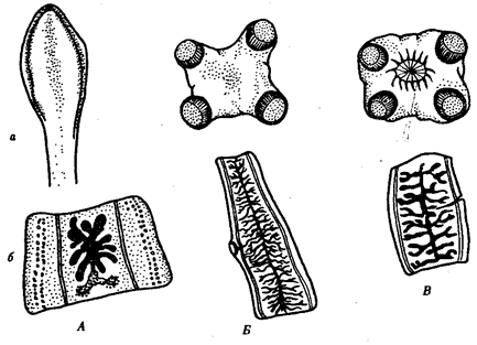 Рис. 20.9. Ленточные черви, использующие человека как промежуточного хозяина. А — эхинококк; Б — альвеококк: а — половозрелые стадии, б — финны Личная профилактика заражения — мытье рук после контактов с пастушьими собаками. Общественная профилактика — обследование и дегельминтизация собак, недопущение скармливания им органов больных животных. Альвеококк Alveococcus multilocularis (рис. 20.9, Б ) — возбудитель альвеококкоза. Половозрелая форма отличается от эхинококка меньшими размерами тела (до 2 мм) и деталями строения крючьев и матки. Финнозная стадия состоит из множества мелких пузырьков, постоянно почкующихся друг от друга наружу, благодаря чему финна представляет собой постоянно растущий узел. В каждом пузырьке находится зародышевая головка паразита. Рост финны разрушает окружающие ткани наподобие злокачественной опухоли. Возможен и отрыв отдельных пузырьков с распространением патологического процесса по организму. Природные очаги альвеококкоза имеются в Сибири, Средней Азии, на Урале и Дальнем Востоке, а также в Северной Америке, в Центральной и Южной Европе. Жизненный цикл принципиально не отличается от эхинококка, но окончательными хозяевами этого паразита являются дикие хищники — лисы, песцы, волки, реже домашние — собаки, промежуточными — мышевидные грызуны, иногда человек. Альвеококкоз — более тяжелое заболевание, чем эхинококкоз, в связи с инвазивным характером роста финны. Личная профилактика — как при эхинококкозе, общественная — соблюдение правил гигиены при обработке шкур промысловых животных, а также запрещение скармливания собакам тушек грызунов. Spiromeira erinacei (рис. 20.10, А ) — возбудитель спарганоза. Половозрелый паразит обитает в кишечнике кошачьих и псовых. Первыми промежуточными хозяевами являются циклопы, вторыми — земноводные, пресмыкающиеся, некоторые птицы и даже человек. При проматывании воды с циклопами происходит заражение. Плероцеркоид поселяется в соединительной ткани, под кожей, под конъюнктивой глаза и даже в мозге. Размеры его от 0,5 до 30 см. Заражение людей возможно при поедании мяса лягушек и змей. В таком случае человек также остается вторым промежуточным хозяином, так как в его теле продолжает паразитировать плероцеркоид. Описанный вид гельминта расселен в Восточной и Юго-Восточной Азии, в Австралии, Америке и Африке. Диагностика осложнена. Обычно диагноз ставится во время хирургического вмешательства. Профилактика — фильтрование воды, употребляемой для питья, и термическая обработка экзотических продуктов питания — мяса лягушеки змей.