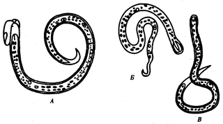 Рис. 20.17. Трихинелла. А — половозрелая стадия из кишечника; Б — личинка, вышедшая из капсулы Трихинелла Trichinella spiralis (рис. 20.17) — возбудитель трихинеллеза— мелкий гельминт длиной до 4 мм. Распространен очень широко, на всех континентах и во всех природно-климатических зонах. Этому благоприятствуют такие особенности биологии паразита, как способность личинок переживать неблагоприятные условия на протяжении десятков лет. Хозяевами трихинеллы могут быть различные хищные и всеядные млекопитающие, а также человек. Распространение трихинелл происходит обычно при поедании животными друг друга. Человек заражается, поедая мясо зараженных животных, чаще всего свиней. Проглоченные личинки в кишечнике быстро достигают половой зрелости. Оплодотворенные самки рождают живых личинок, которые пробуравливаются через стенку кишечника и, транспортируясь кровью, оседают в поперечно-полосатых мышцах: чаще всего в диафрагме, межреберных, дельтовидных. Здесь они после разрушения части мышечных волокон спирально скручиваются и инкапсулируются. При попадании трихинелл в ослабленный организм возможно развитие первого поколения личинок не в мышцах хозяина, а в ворсинках его кишечника, после разрушения которых личинки вновь возвращаются в просвет кишки, достигают там половой зрелости и размножаются. Следующее поколение личинок уже оседает в мышцах хозяина. Этим достигается резкое увеличение размеров популяции паразита, которые в обычных случаях размножаются у одного хозяина лишь один раз, и соответственно резкое утяжеление заболевания, часто приводящее к смерти. Личинки трихинелл после гибели хозяина сохраняют жизнеспособность даже после разложения его трупа. В пищеварительной системе трупоядных наземных и даже водных животных — жуков-мертвоедов, почвенных червей, мелких ракообразных, рыб, хищных птиц и чаек — личинки сохраняют жизнеспособность в течение нескольких дней. Перечисленные животные выступают в цикле развития паразитов как транспортные хозяева и способны передавать возбудителя по цепи питания до тех пор, пока личинки не попадут в организм хозяина, в котором возможно нормальное развитие паразита. Сложными цепями питания с передачей личинок транспортными хозяевами обеспечивается фактически всесветное распространение трихинеллы и существование таких природных очагов трихинеллеза, как очаги даже в зоне арктических пустынь. Известно, что 67% ездовых собак в Гренландии и 50% белых медведей о. Шпицберген, многие тюлени и даже некоторые китообразные поражены трихинеллезом. Основной источник питания этих животных — рыба, морские беспозвоночные, яйца и птенцы морских птиц и т. д. Эти животные становятся транспортными хозяевами трихинеллы после того, как разлагающиеся трупы и помет птиц оказываются в воде и личинки паразита попадают в организм водных ракообразных, которыми питаются более крупные беспозвоночные и рыбы. Поедая их, млекопитающие постепенно накапливают в организме огромное количество трихинелл, становясь опасным источником заражения человека. Свиньи как наиболее частый источник инвазий человека заражаются, поедая не только крыс и мышей, но и насекомых, червей, рыбу, трупы и помет птиц, в которых сохраняются жизнеспособные личинки. Патогенное действие трихинеллы включает как общеаллергические явления, так 