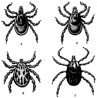 Рис. 21.2. Иксодовые клещи. А — собачий; Б — таежный; В — пастбищный; Г — хиаломма Из домашних животных таежным энцефалитом чаще всего заражаются козы в связи с особенностями их поведения на пастбищах: они предпочитают питаться листьями и ветвями кустарников, при этом чаще, чем коровы, продираются через заросли и используют в лесах малозаметные тропы диких животных. В таких условиях резко повышается возможность их укуса клещами. Кроме того, вместе с ветвями козы проглатывают сидящих на них клещей, поедают они также и клещей, присосавшихся к коже. Сами козы болеют энцефалитом в легкой форме, но вирус энцефалита выделяется ими с молоком. Употребляя такое молоко, способен заражаться и человек. Способ заражения через козье молоко был впервые описан в Юго-Восточной Словакии в 1951 г., когда всего за несколько дней в небольшом городке Рожнява заболело энцефалитом 1660 человек. Все они покупали в магазине коровье молоко, в которое была подмешана порция молока от четырех коз из пригородной деревни. Вирусологические исследования показали, что и коровье молоко может быть заражено вирусом, но козье молоко содержит вирусы в более высокой концентрации и эпидемиологически гораздо опаснее.